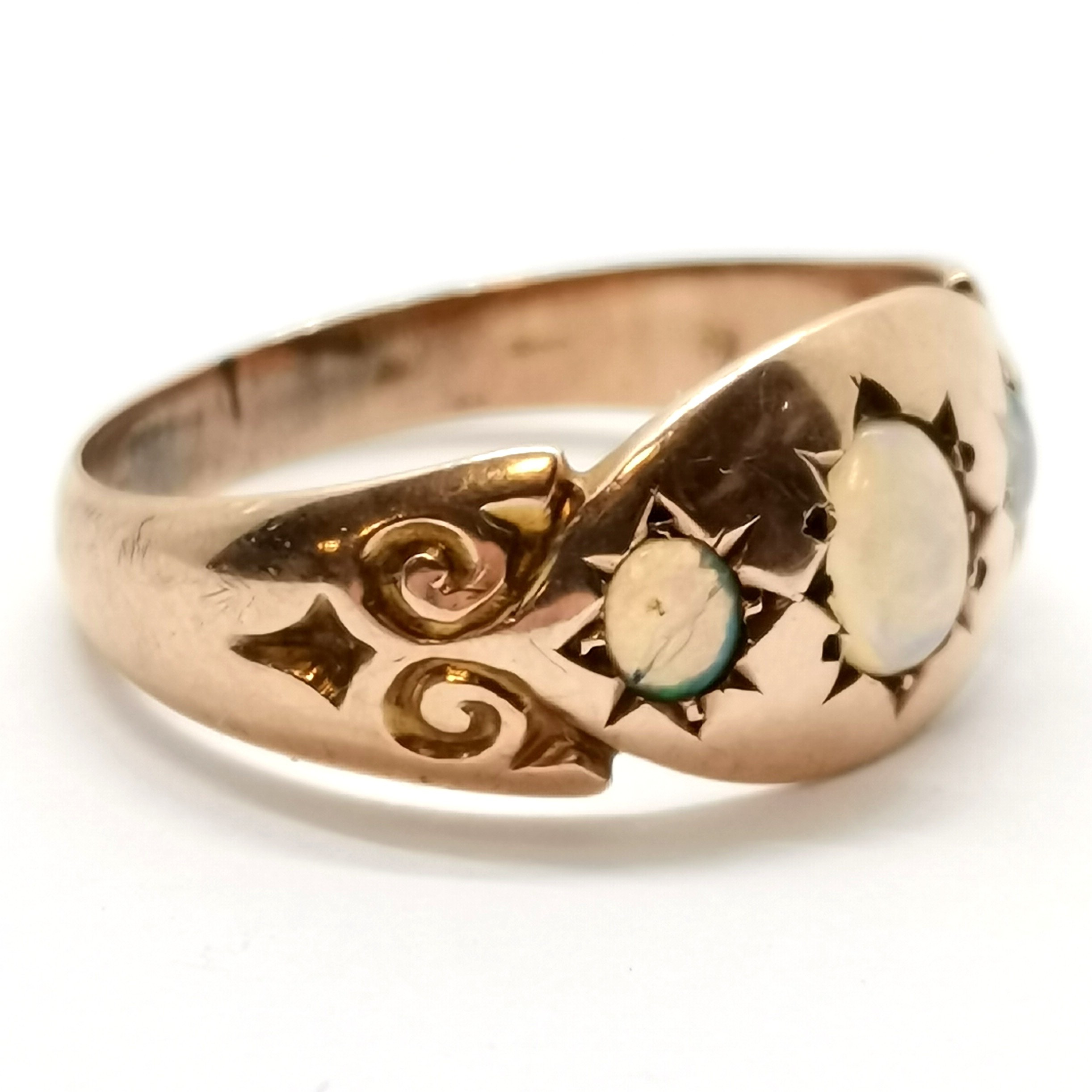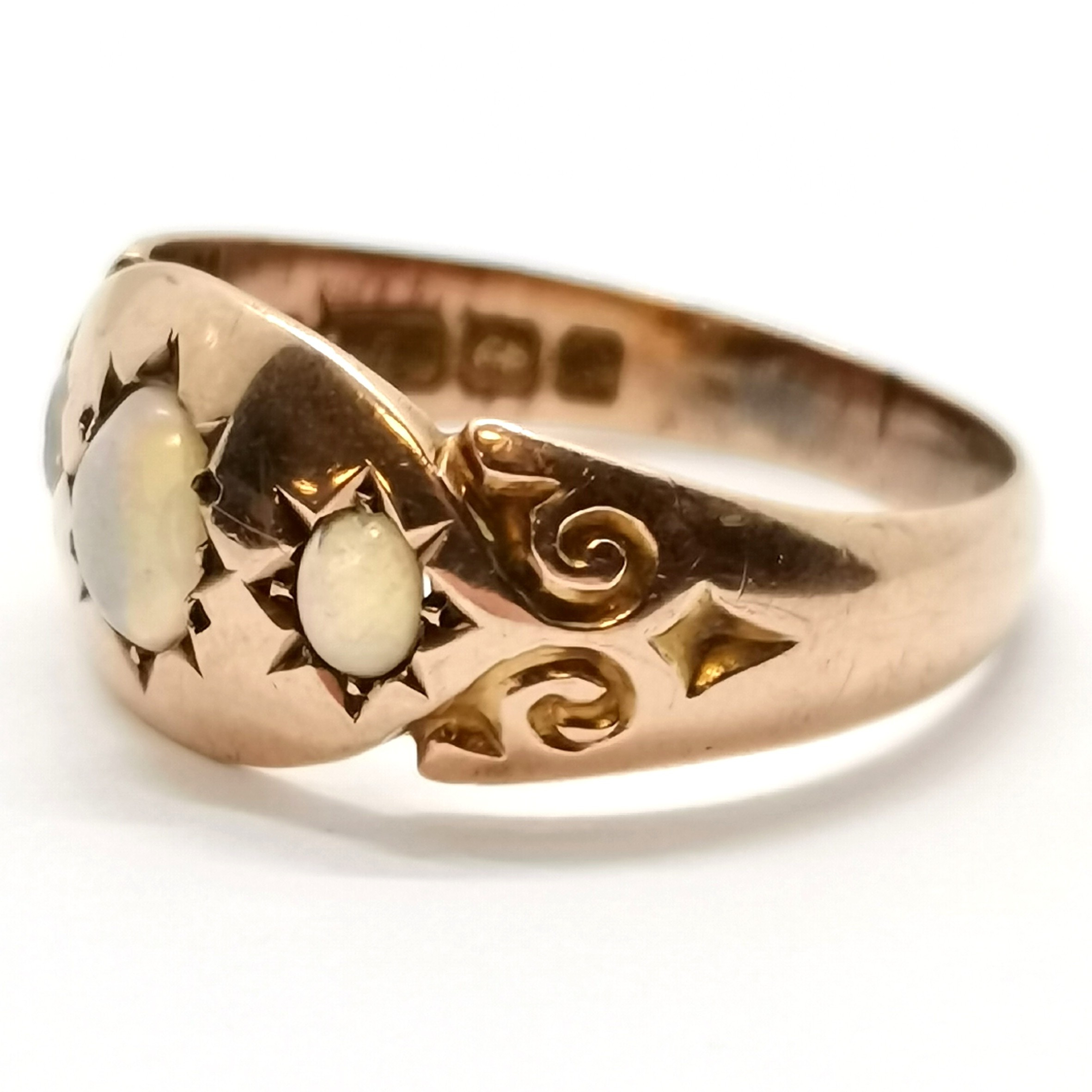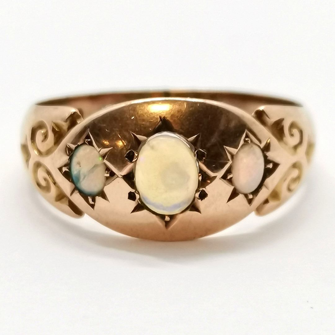5018965. ANTIQUE 9ct GOLD 3 STONE OPAL RING.