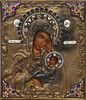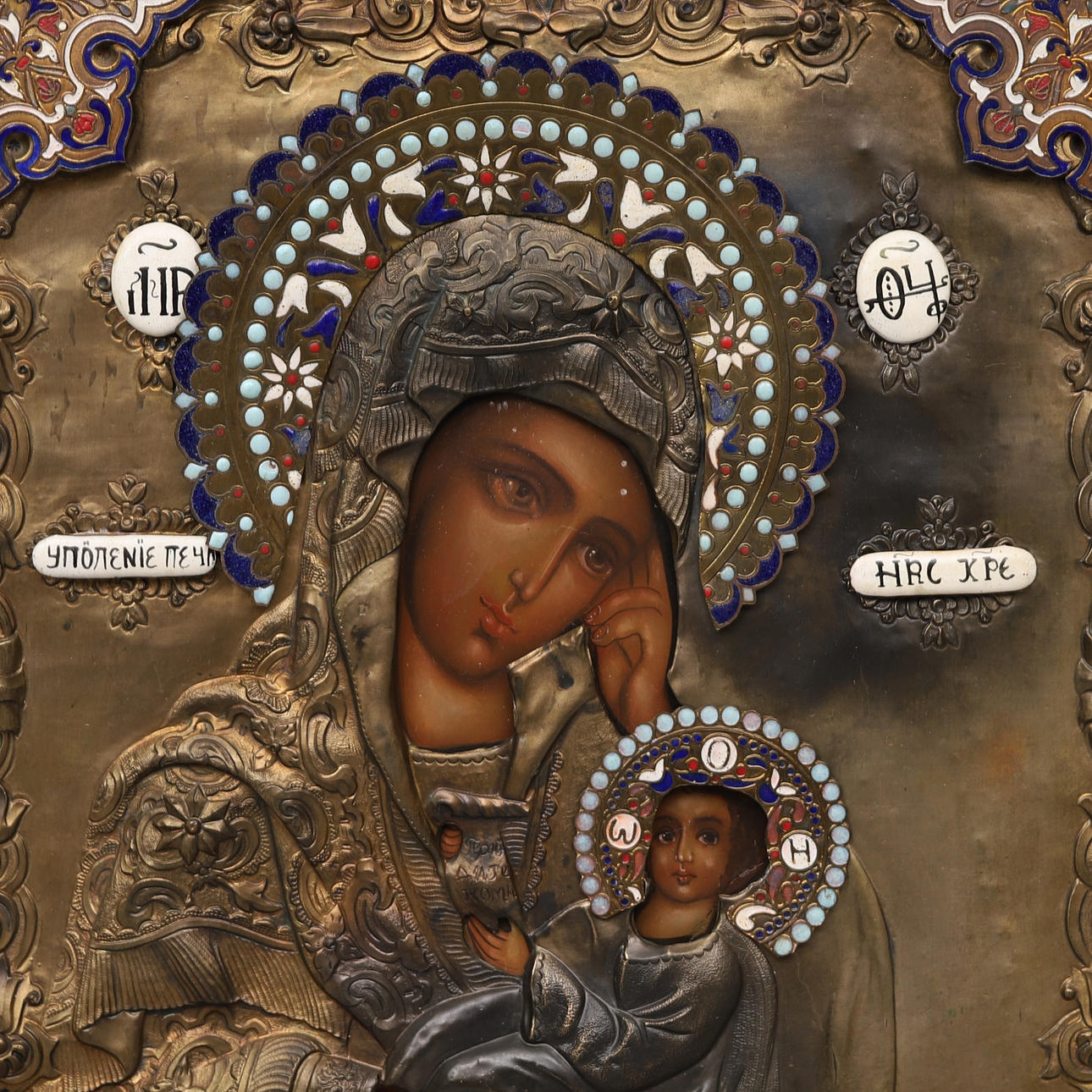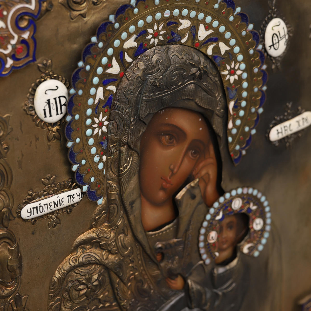 Madonna with child. Rizza made of brass with details of enamel. 31 x 27 cm.