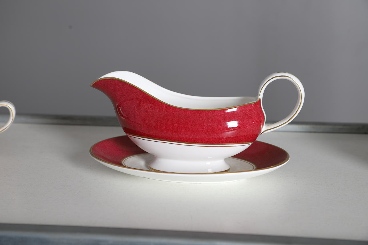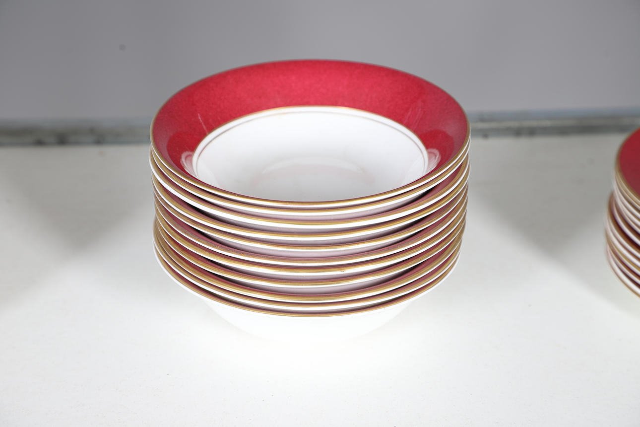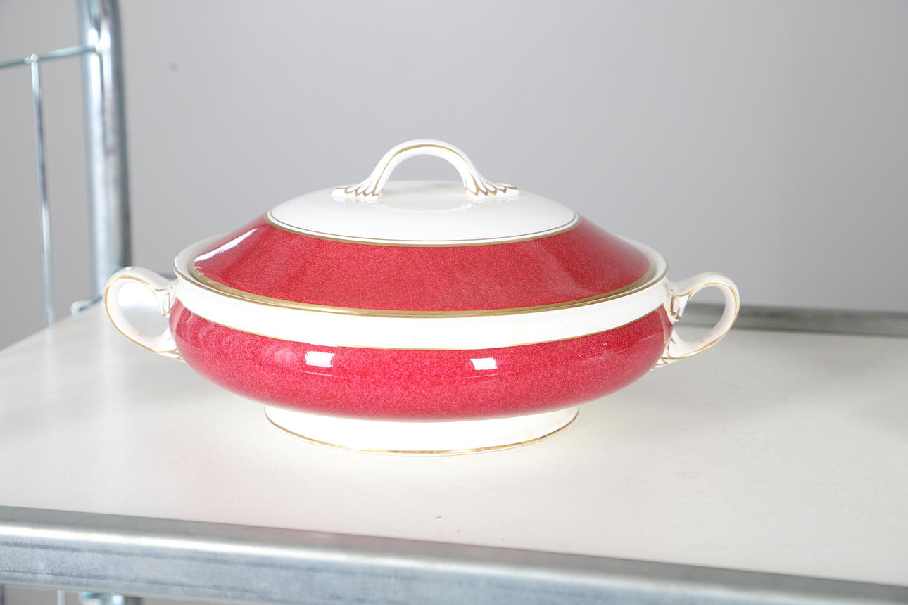 each with printed marks to underside, to include lidded tureens, serving dishes, soup bowls, cereal bowls, side plates, dinner plates, graduated platters, and a gravy boat and stand (qty).