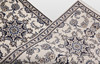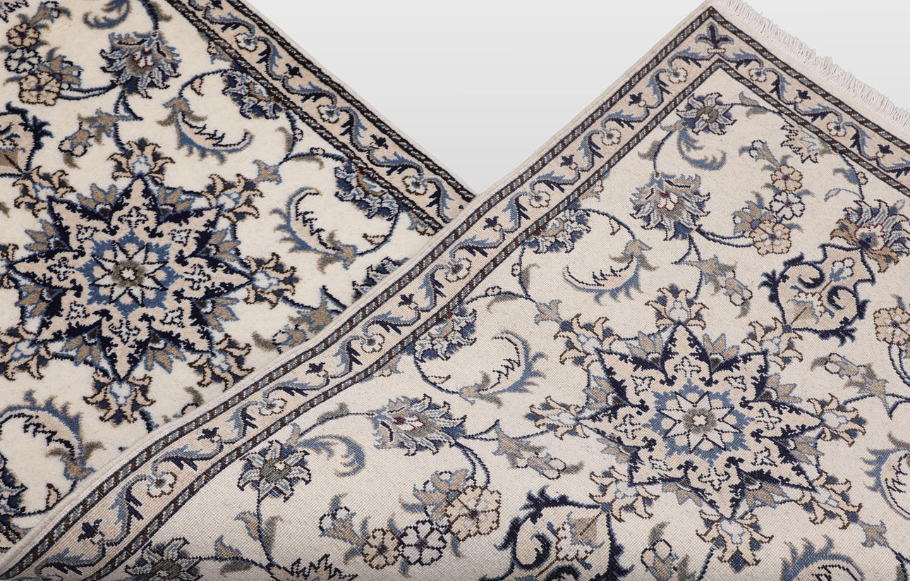 Nain gallery model with bright bottom color, four medallions, and a center field covered in floral ornaments, palmettes and arabesques in blue, beige and gray-blue tones. The border has light bottom with decoration of palm branches. The forelock is made of wool and the warp is of cotton.