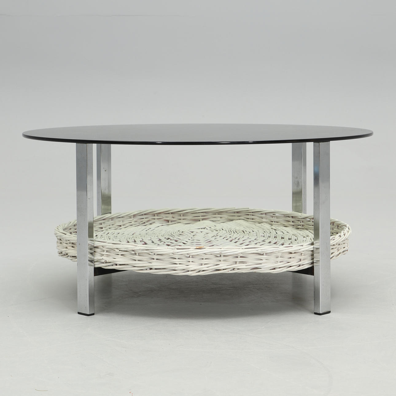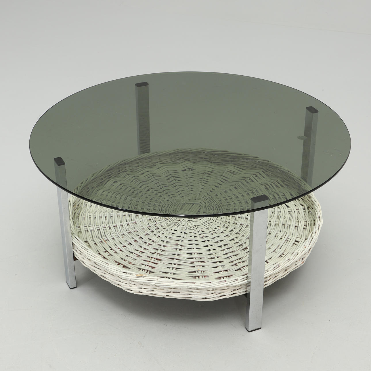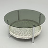 Aluminum undercarriage with magazine shelf made of white painted wicker rattan. Round disc made of smoke-coloured glass. Diameter 90, height 41 cm.
