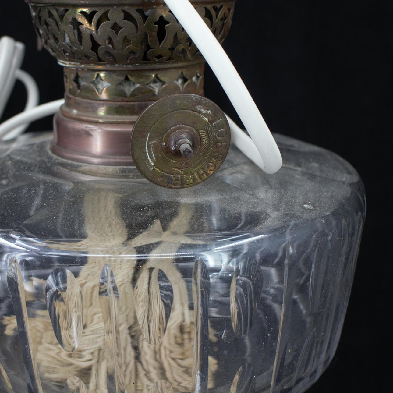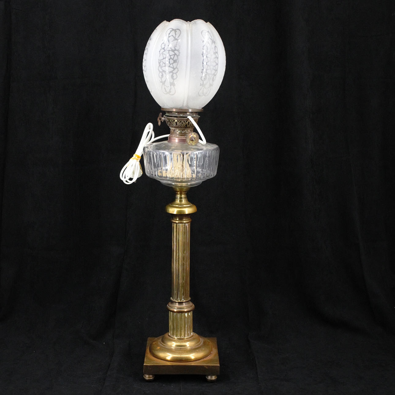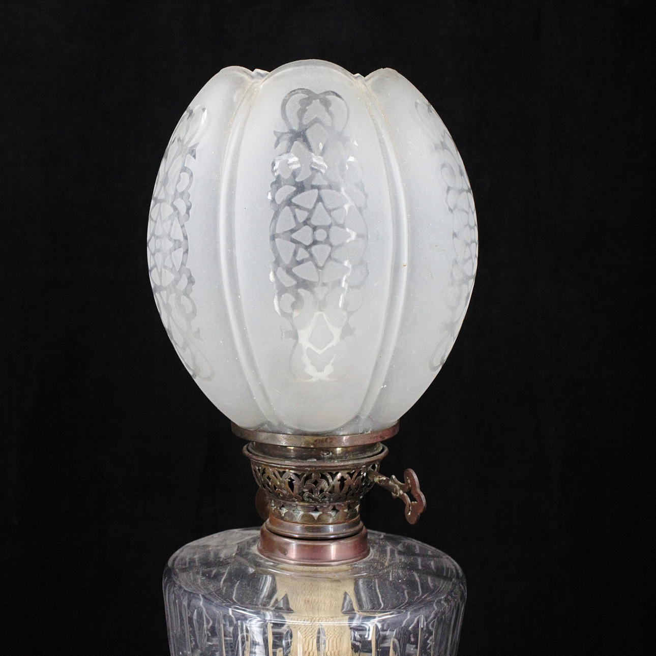 5019333. TABLE PHOTOGENIC LAMP, electrified, brass, container and screen with ground, pantographed decor, 20th century.