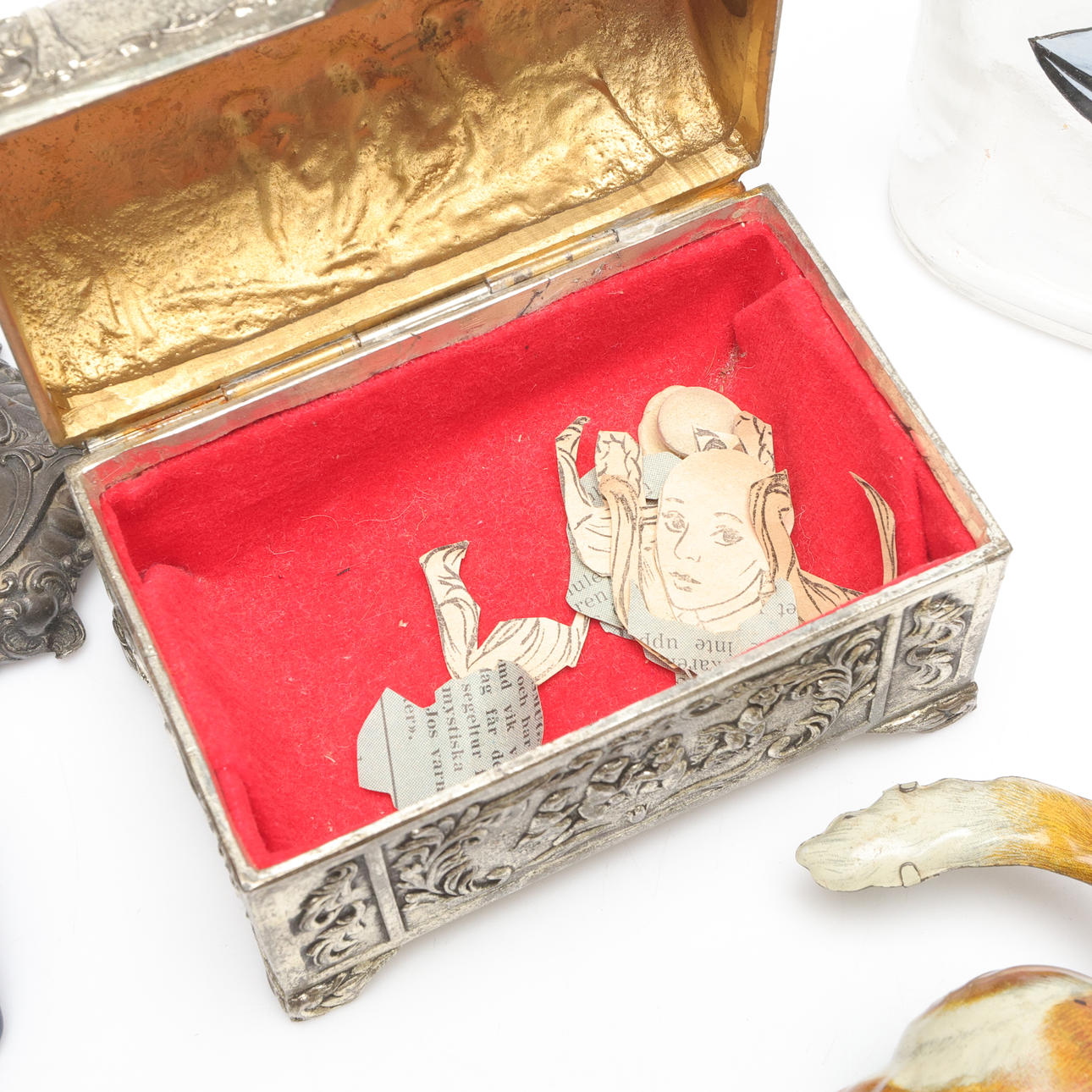 Plunta, motif with Zeppelin, Stockholm Exhibition 1930. Height approx. 21 cm. Napkin holder, brass, Skultuna. Tin toy, dog, with key, etc.