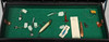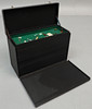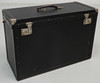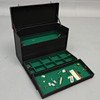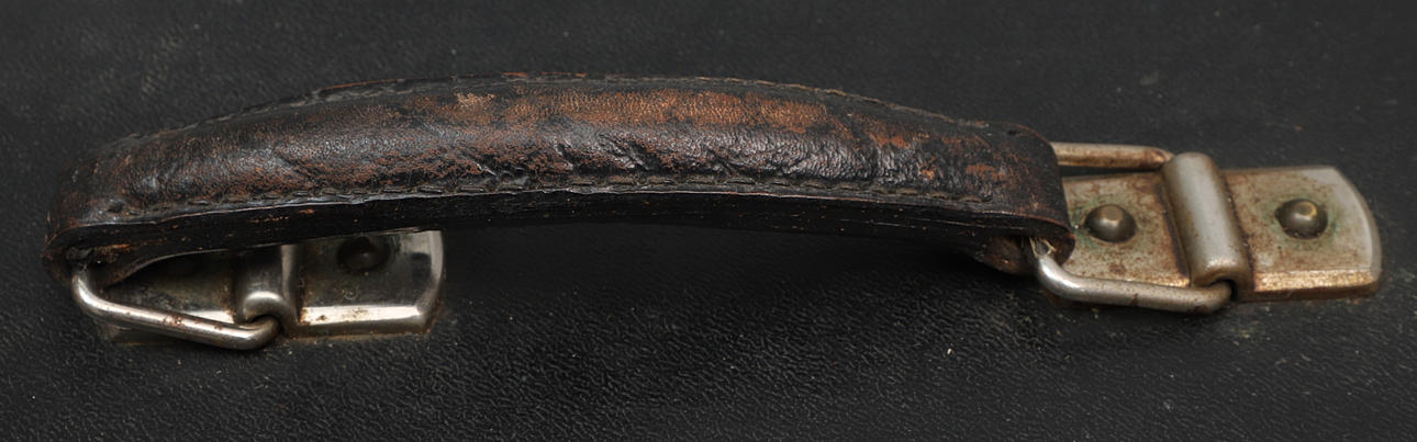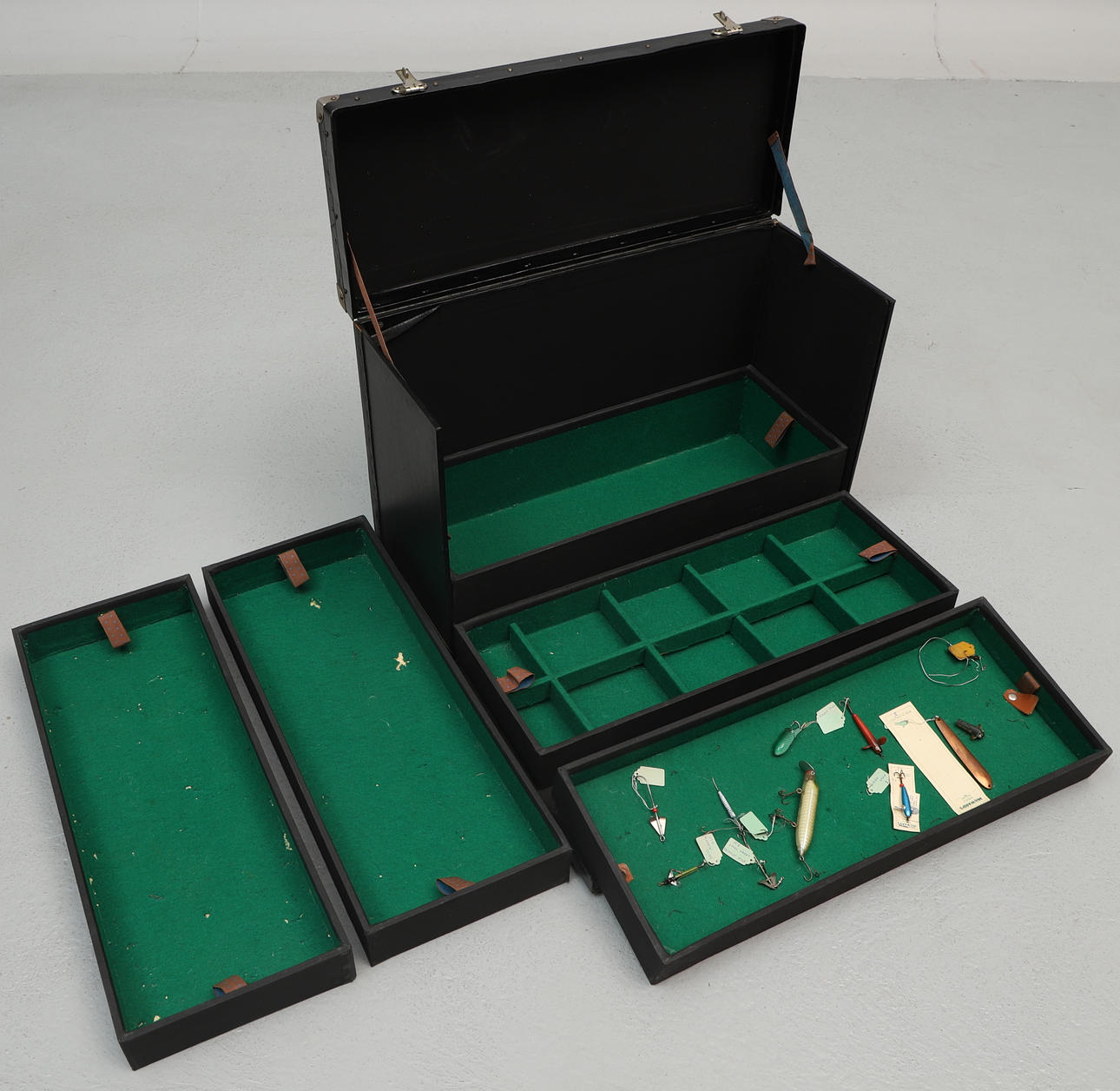 With leather handle. 5 pieces of felt covered cases. One containing different fishing lures.