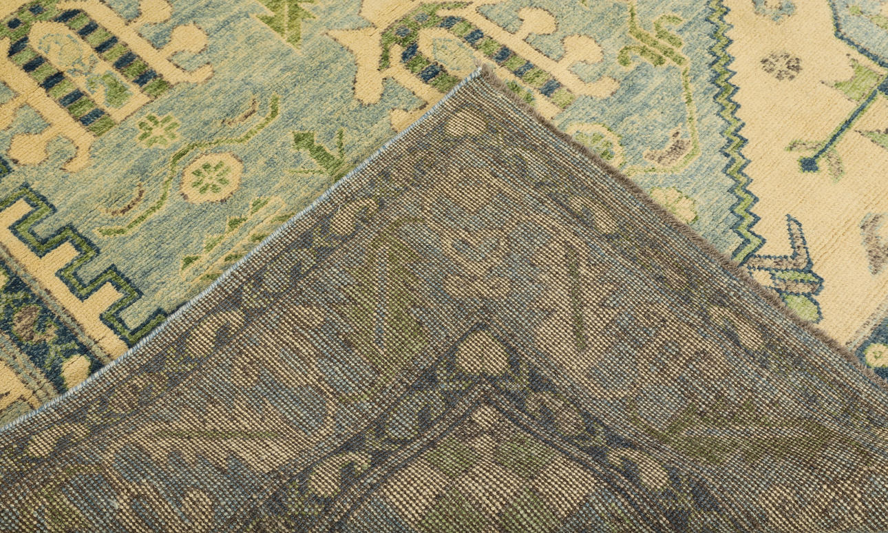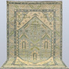 Afshari with blue-gray bottom color and a center field decorated with geometric motifs and stylized plant ornaments in light blue, beige and green. The border has a blue-gray base with stylized plant decor. The forelock is made of wool and the warp is of cotton.