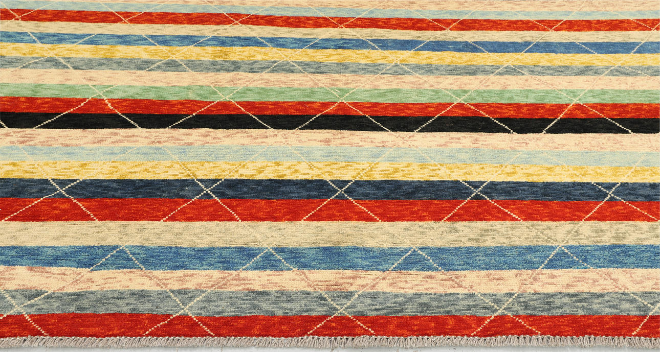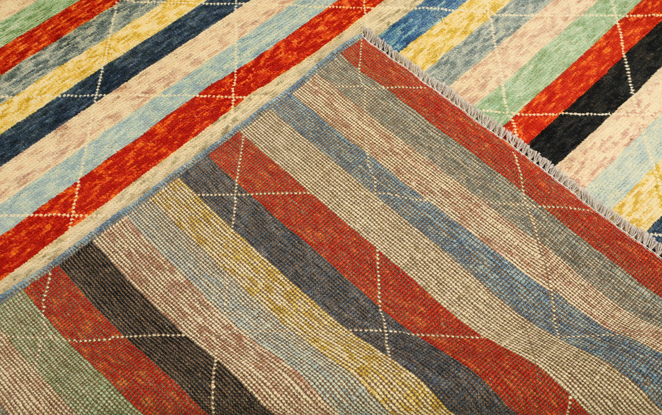 Afshari with a striped pattern in red, blue, yellow, green and black elements and a discreet rhombus pattern in a lighter shade over the entire surface. The forelock is made of wool and the warp is of cotton.