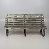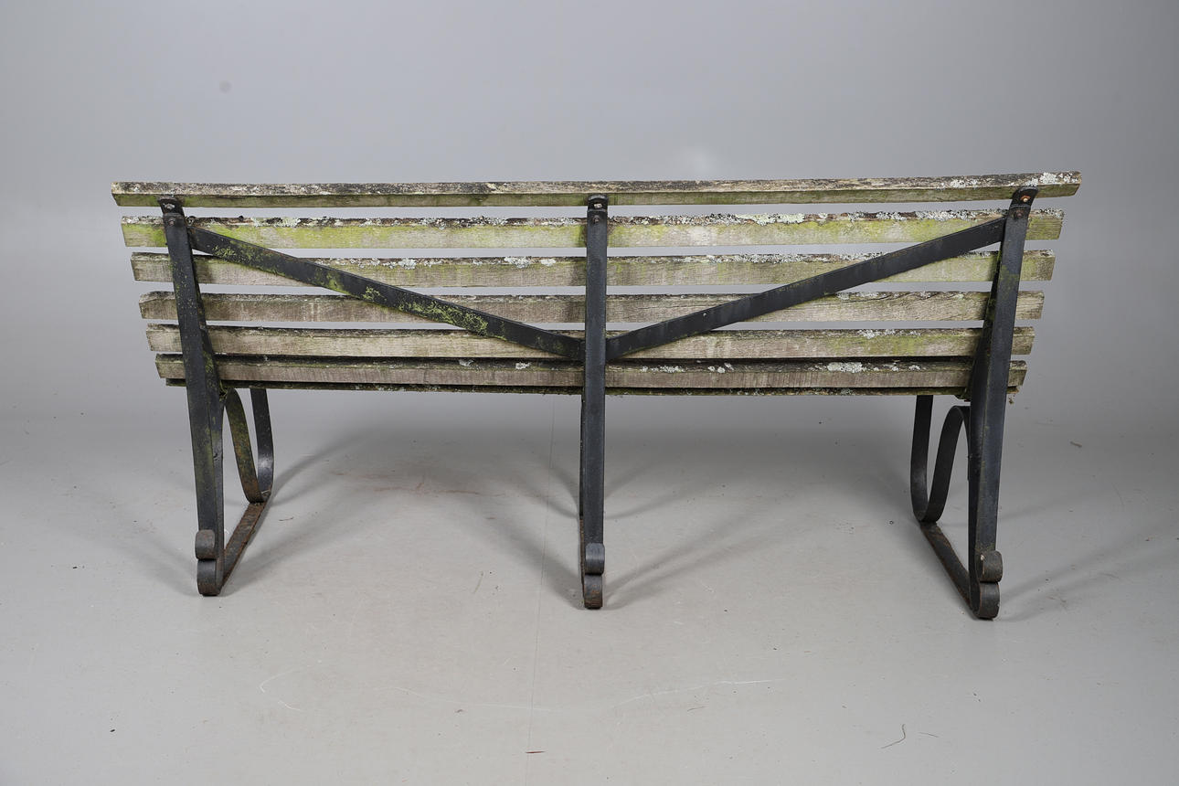 Wooden slats mounted on three scrolled wrought iron mounts, W180 x H90 x D70cm, seat H43cm.