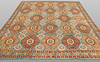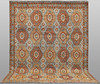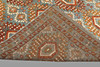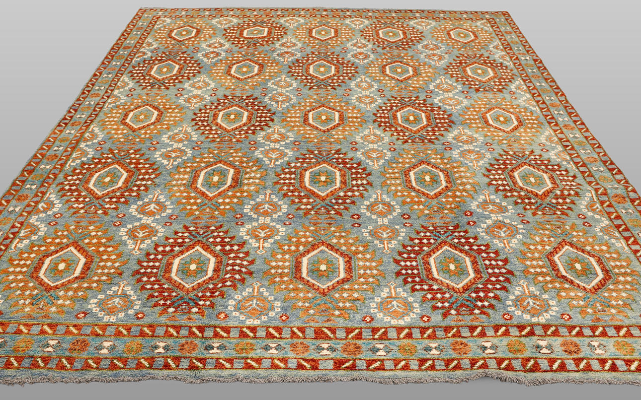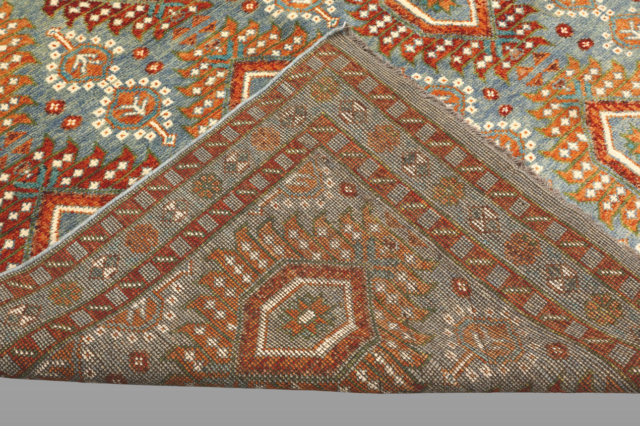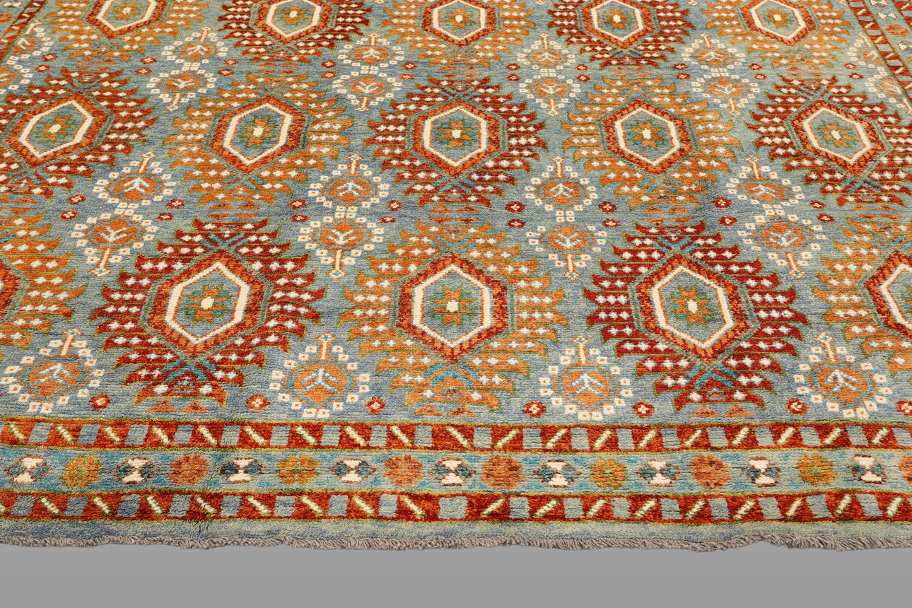 Afshari with light blue bottom color and a center field covered in repeating geometric motifs in rust red, beige and orange. The border has a light blue base with geometric decoration. The forelock is made of wool and the warp is of cotton.