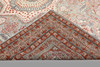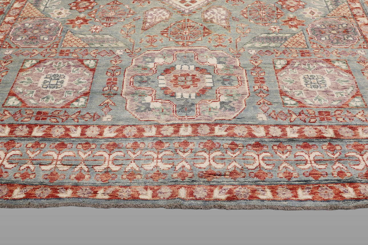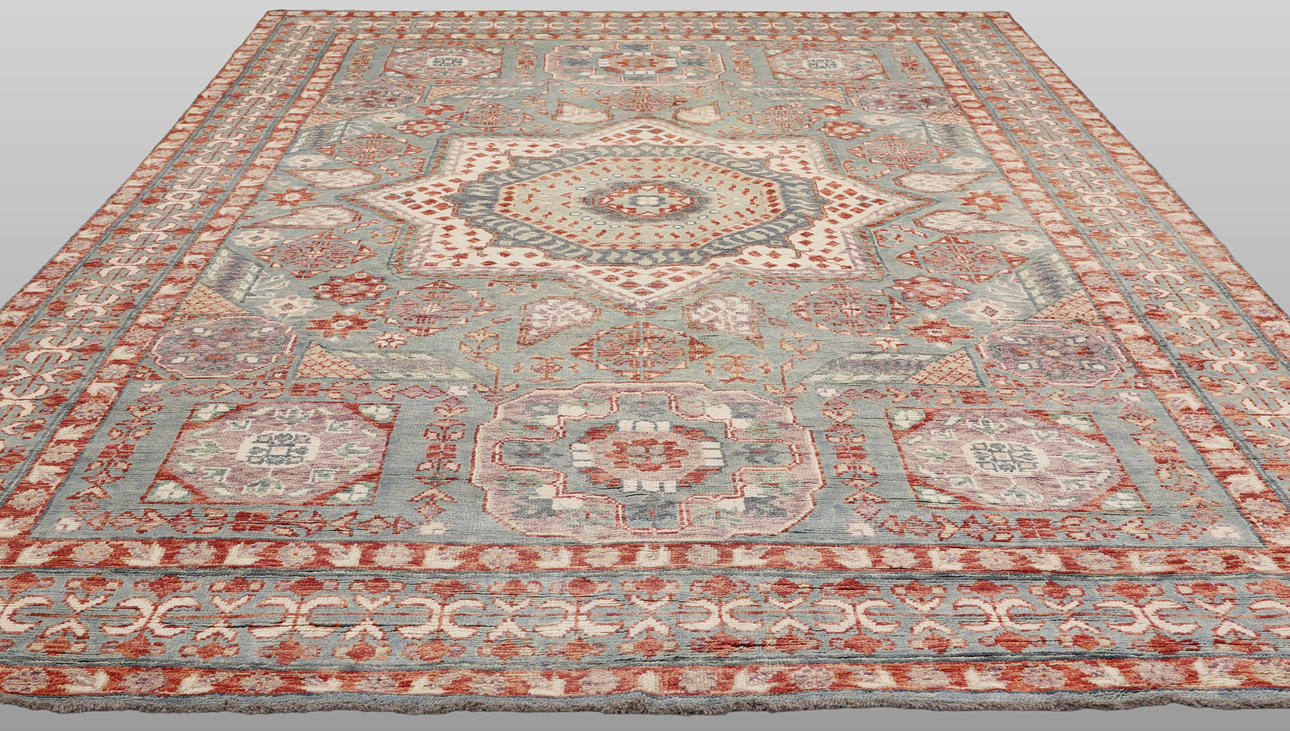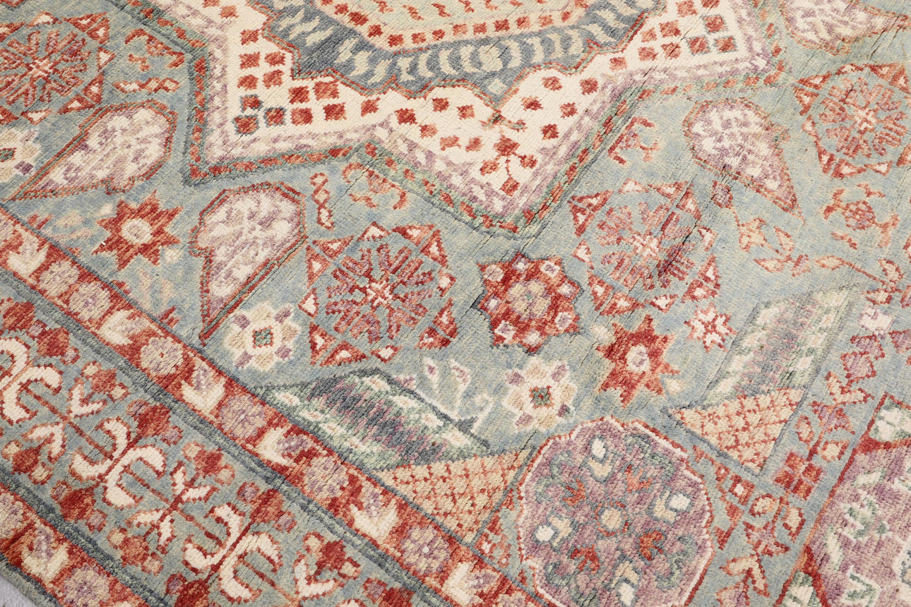 Afshari with light blue bottom color and a star-shaped medallion in blue, beige, red and purple. The center field is decorated with geometric motifs in similar shades. The border has a light blue base with geometric decoration. The forelock is made of wool and the warp is of cotton.
