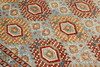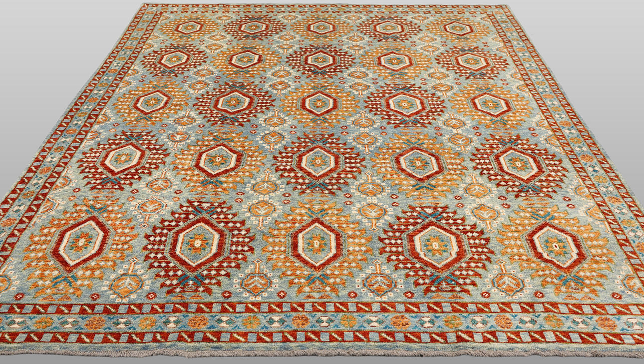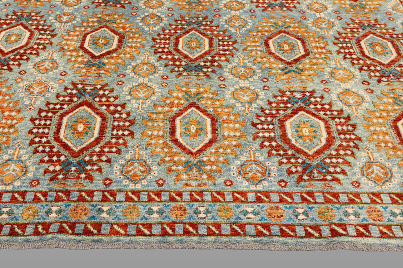 Afshari with light blue bottom color and a center field covered in repeating geometric motifs in rust red, beige and orange. The border has a light blue base with geometric decoration. The forelock is made of wool and the warp is of cotton.