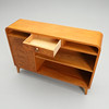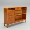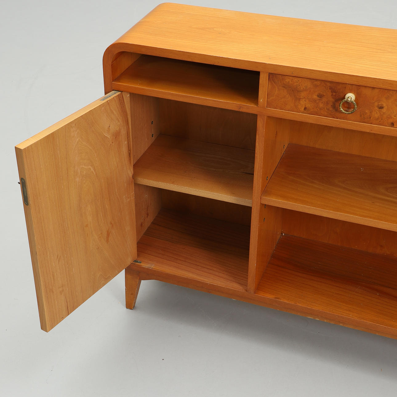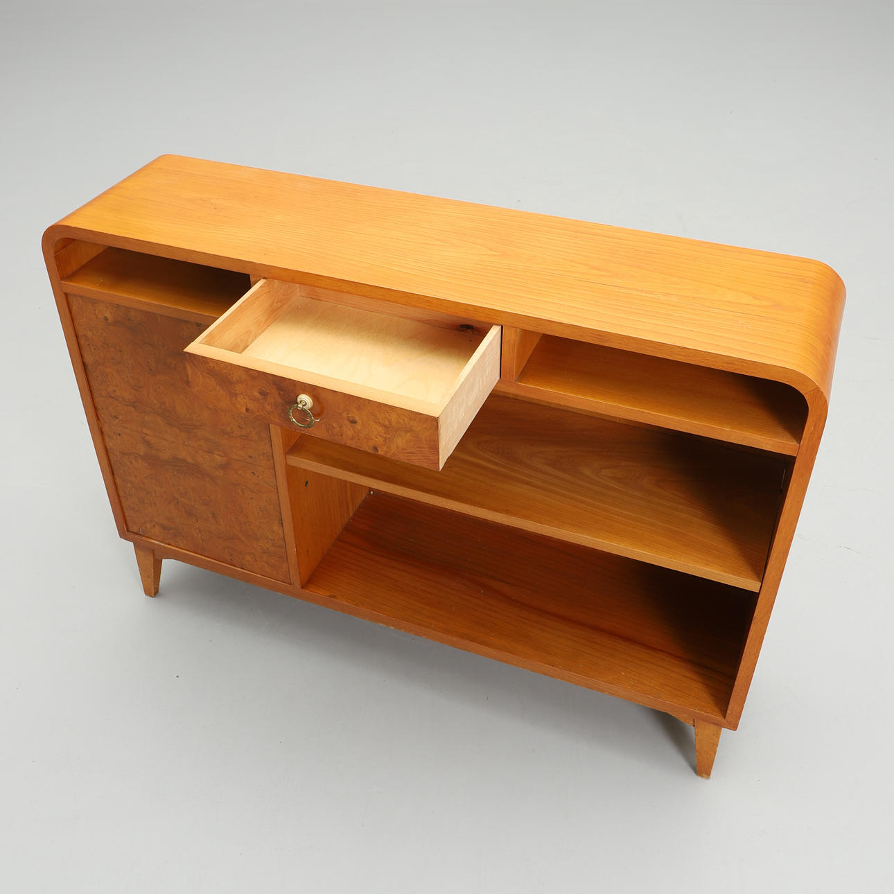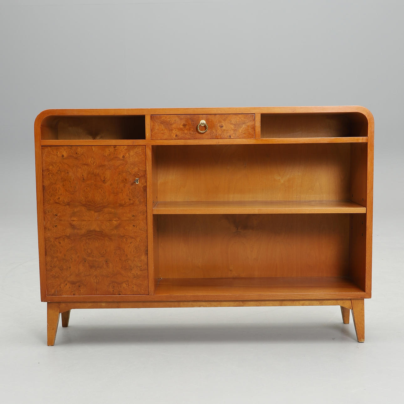 Veneer in elm and masur birch. Front with shelves, a drawer as well as cabinets. Length approx. 113 cm. Depth 28 cm. Height 80 cm.