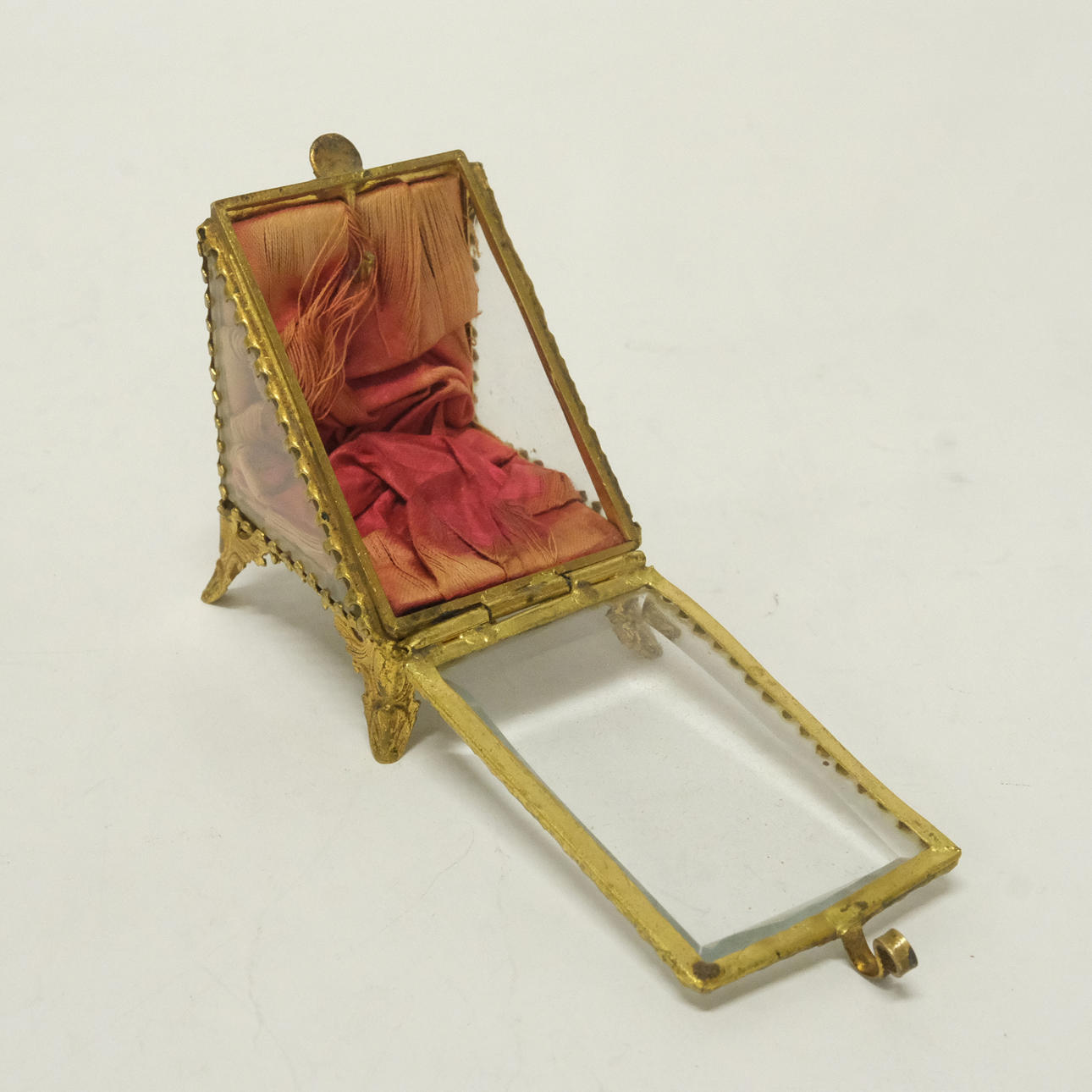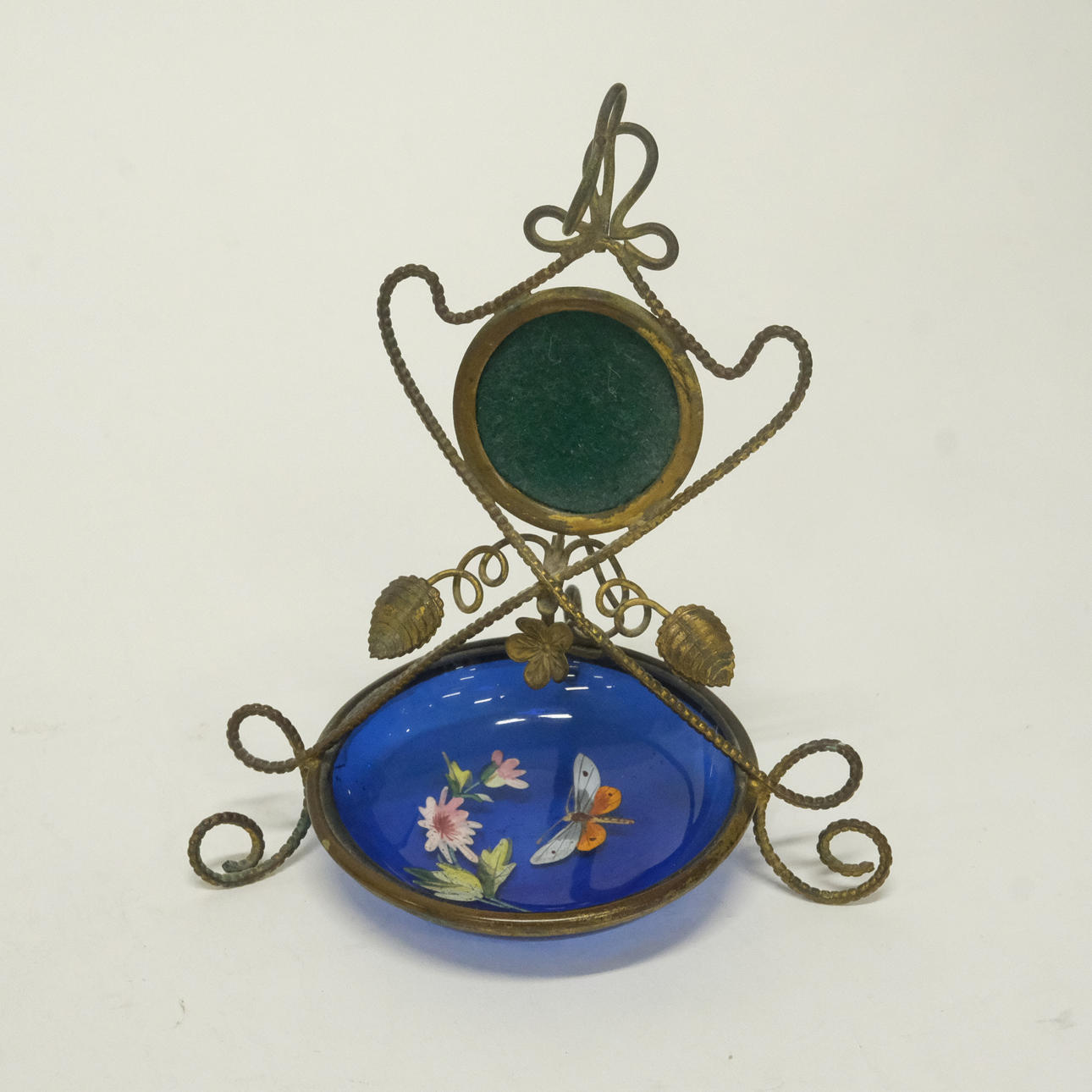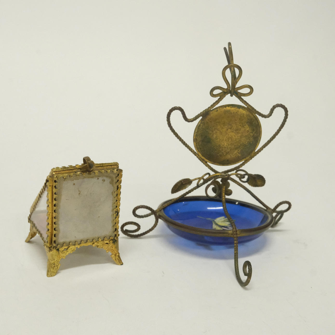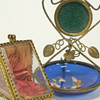 Watch case in glass and metal, height 6,5 cm. Clock stand in metal and glass, enamel decor, height 13 cm.