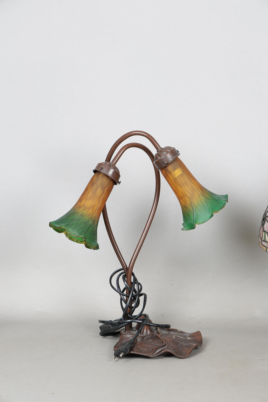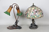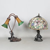 The first example of bronzed form with green and yellow mottled glass shades, 40 cm tall, the second the second example with leaded glazed dome shade, approx. 40 cm tall (2).