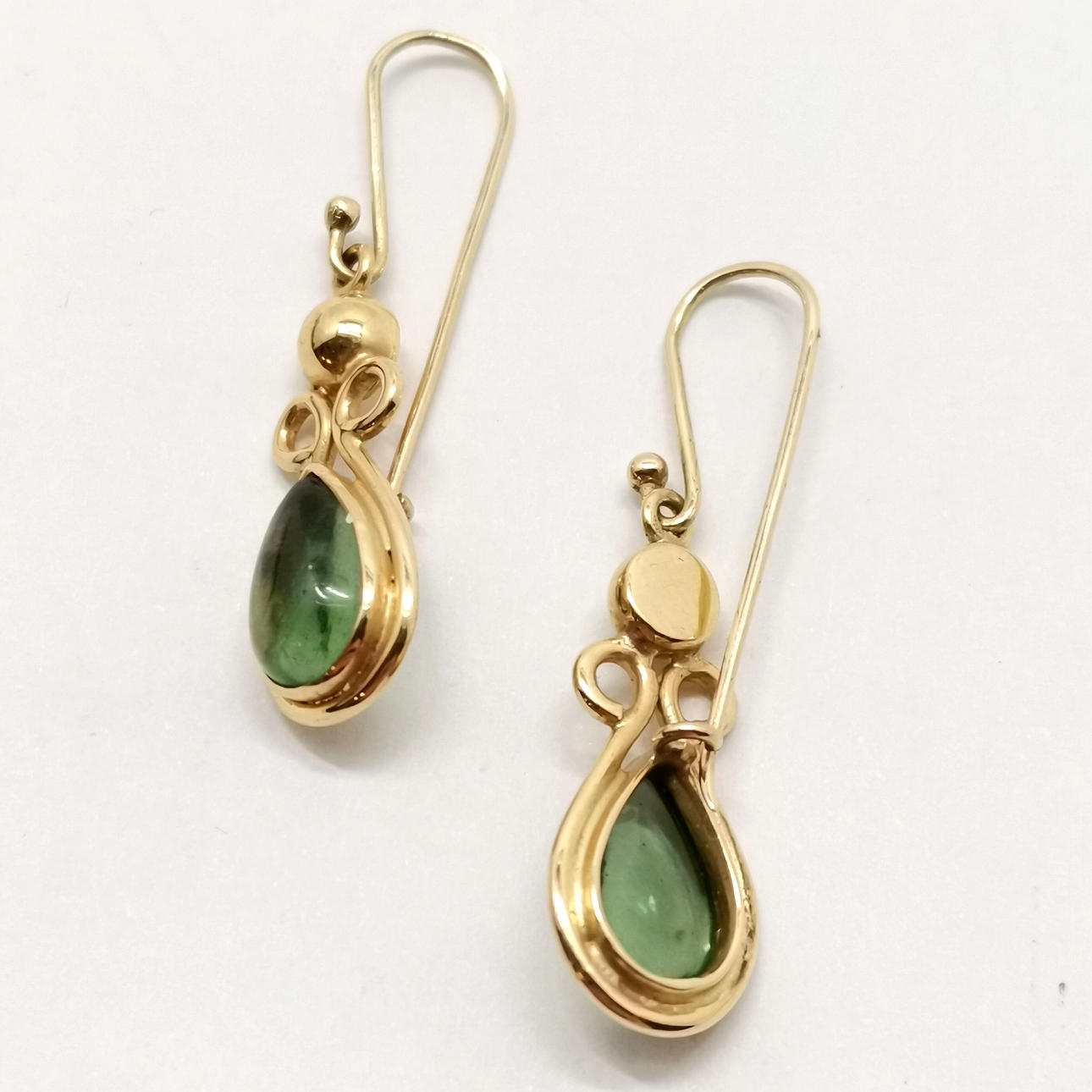 Unmarked (touch tests as 18ct) gold green stone set drop earrings - 4cm drop & 6.3g total weight.