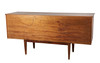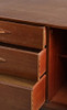 With three central drawers, the top drawer lined with green baize, flanked by two cupboard doors opening to reveal interior shelves, raised on tapering chamfered legs, 152cm wide, 44cm deep, 74cm high.