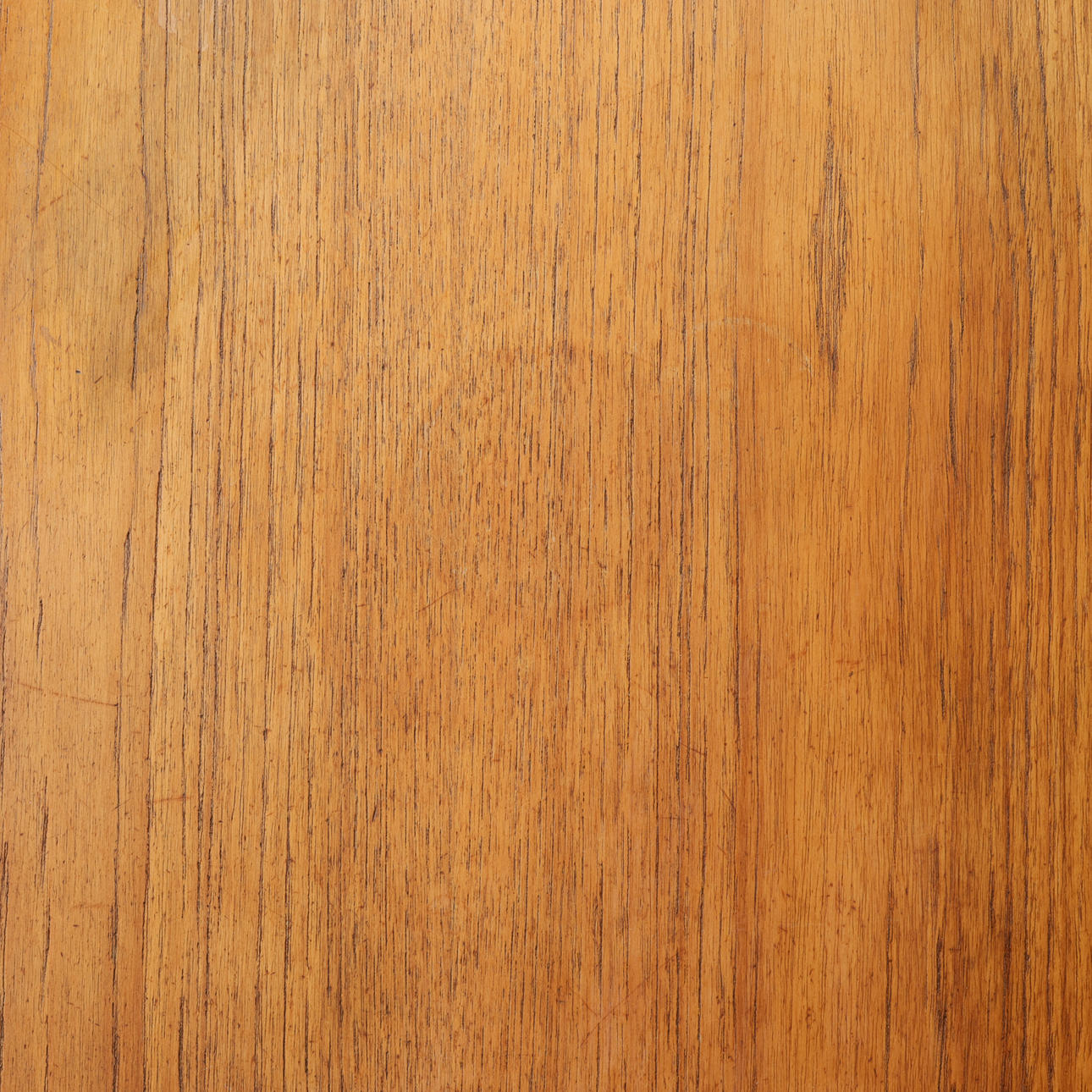 Circular dining table made of teak veneer with pull-out and two additional plates with sheets of teak veneer. Legs of solid teak. Manufactured and branded at Skovmand & Andersen.