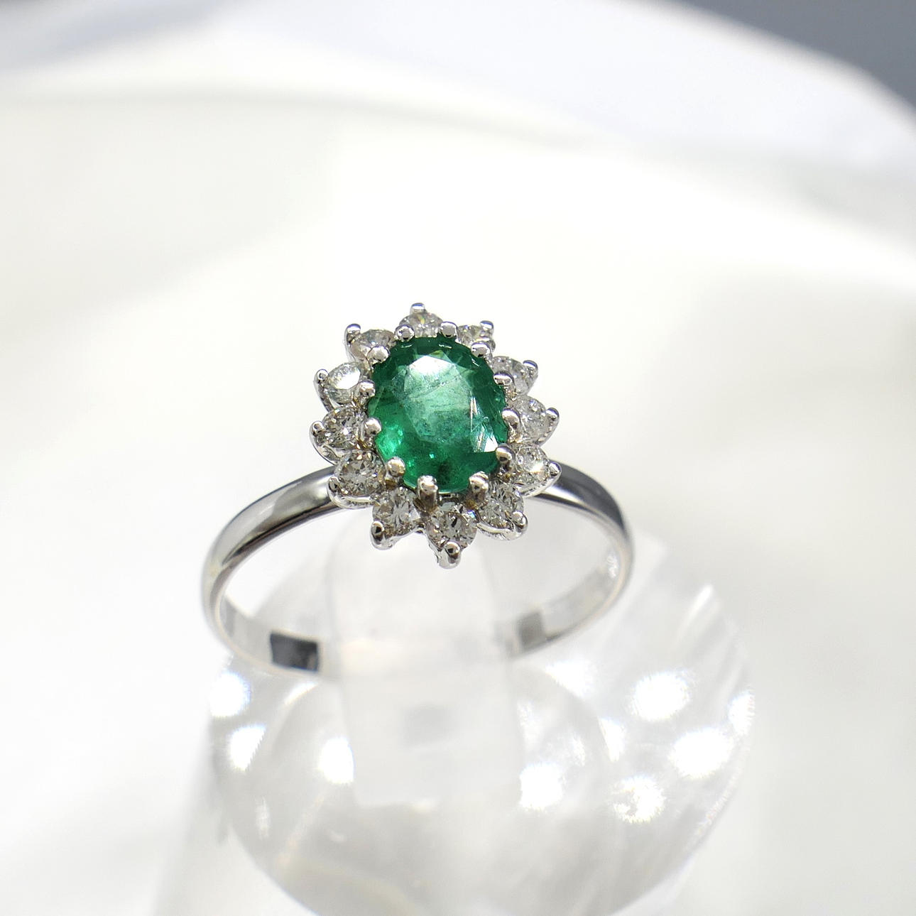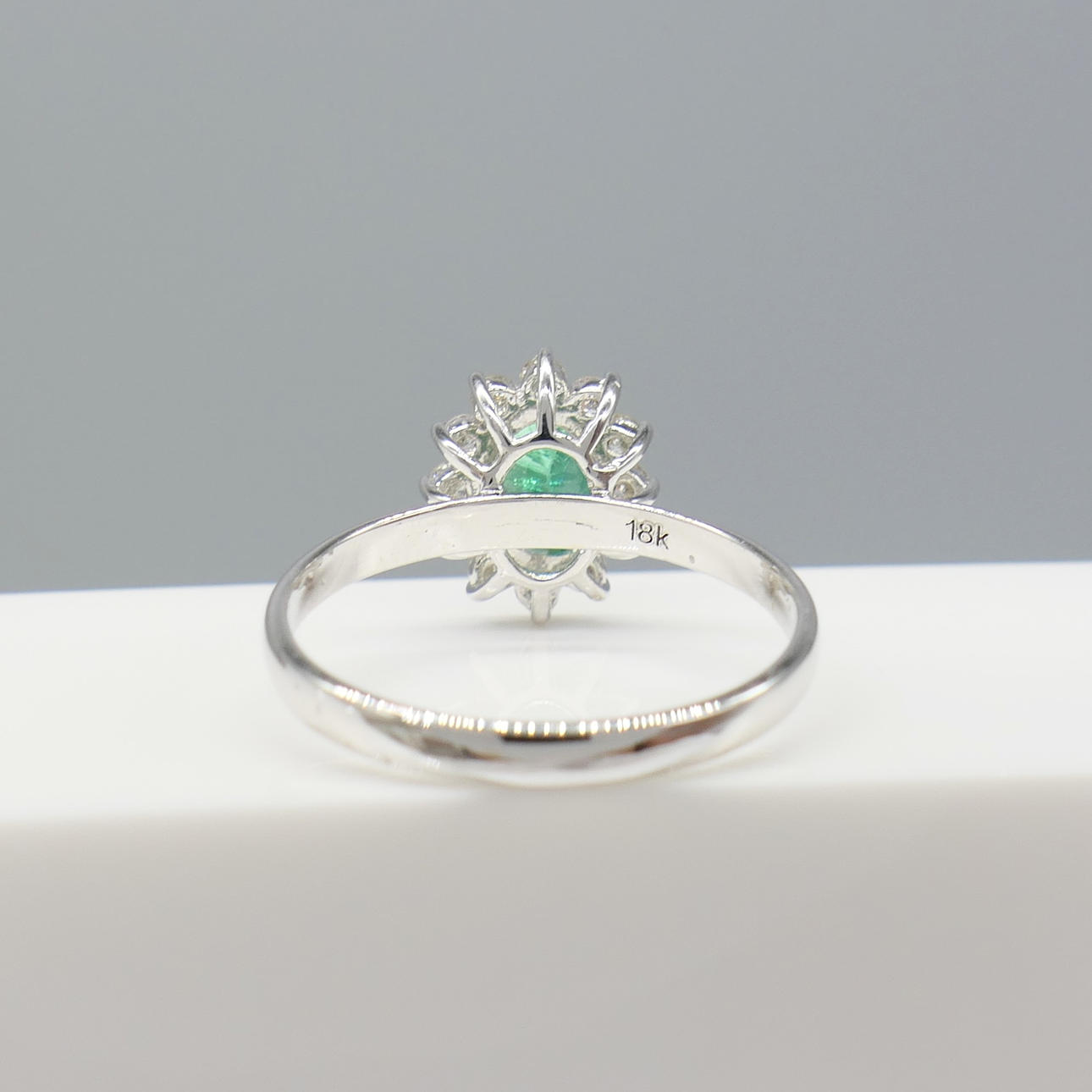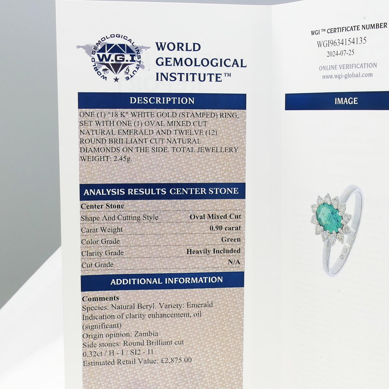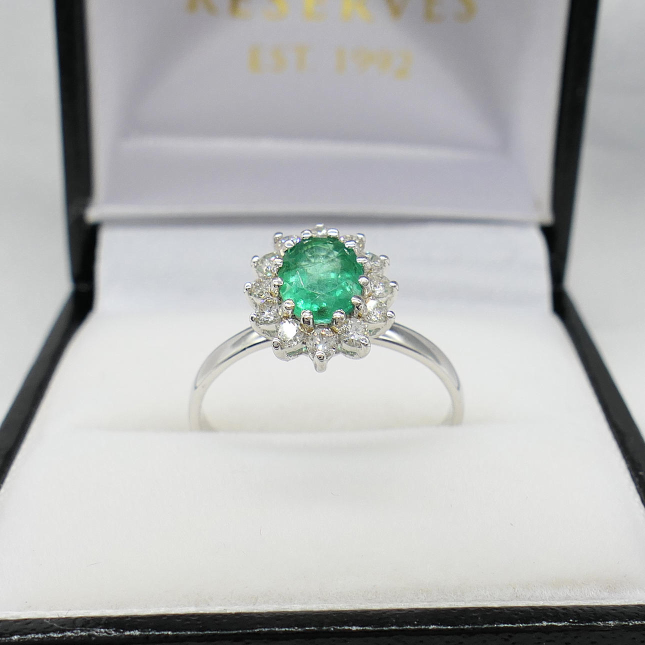 A certificated 18k white gold emerald and diamond cluster ring, with gift box