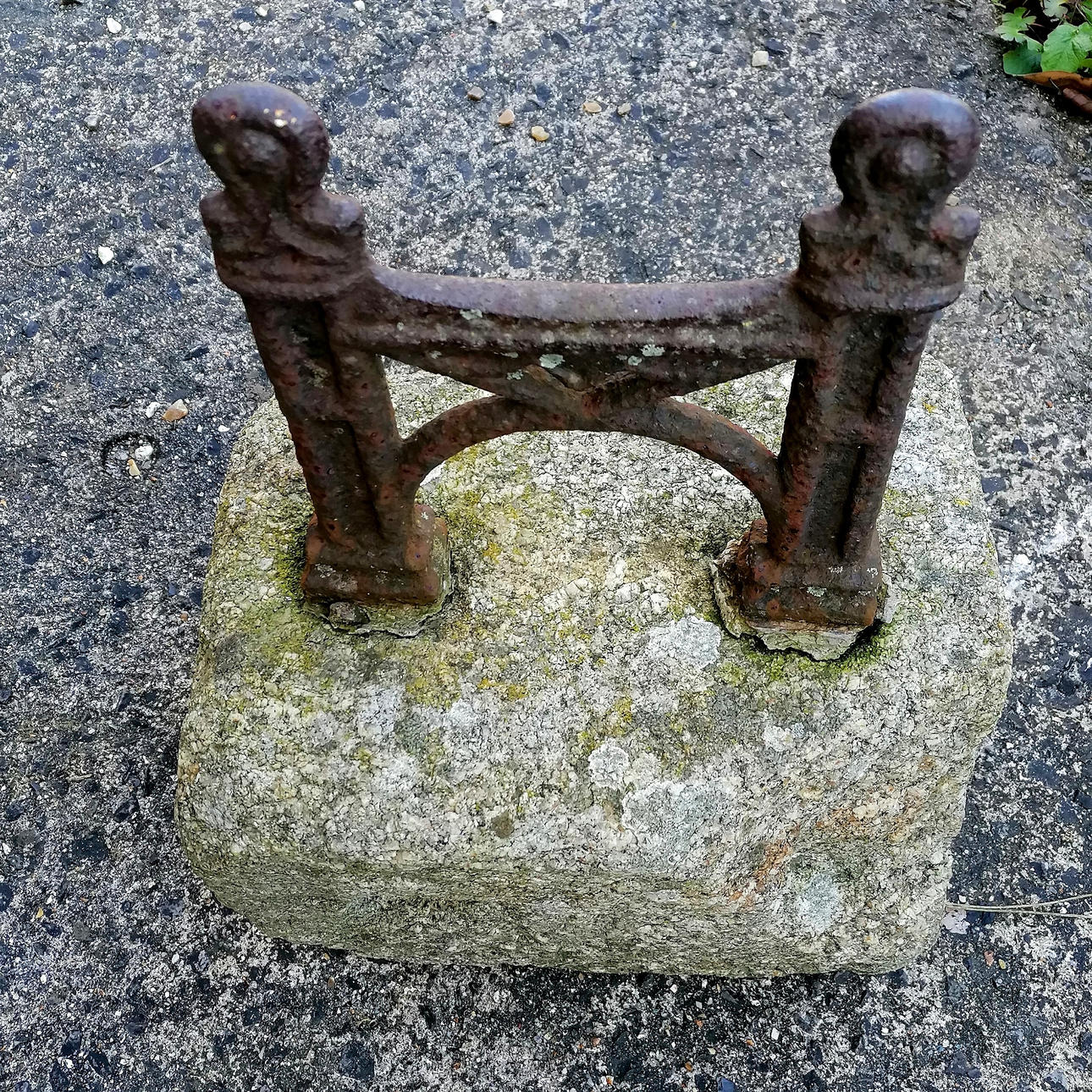 Antique cast iron boot scraper set into a carved stone 46cm high x 22cm x 28cm.