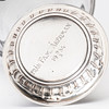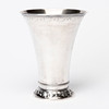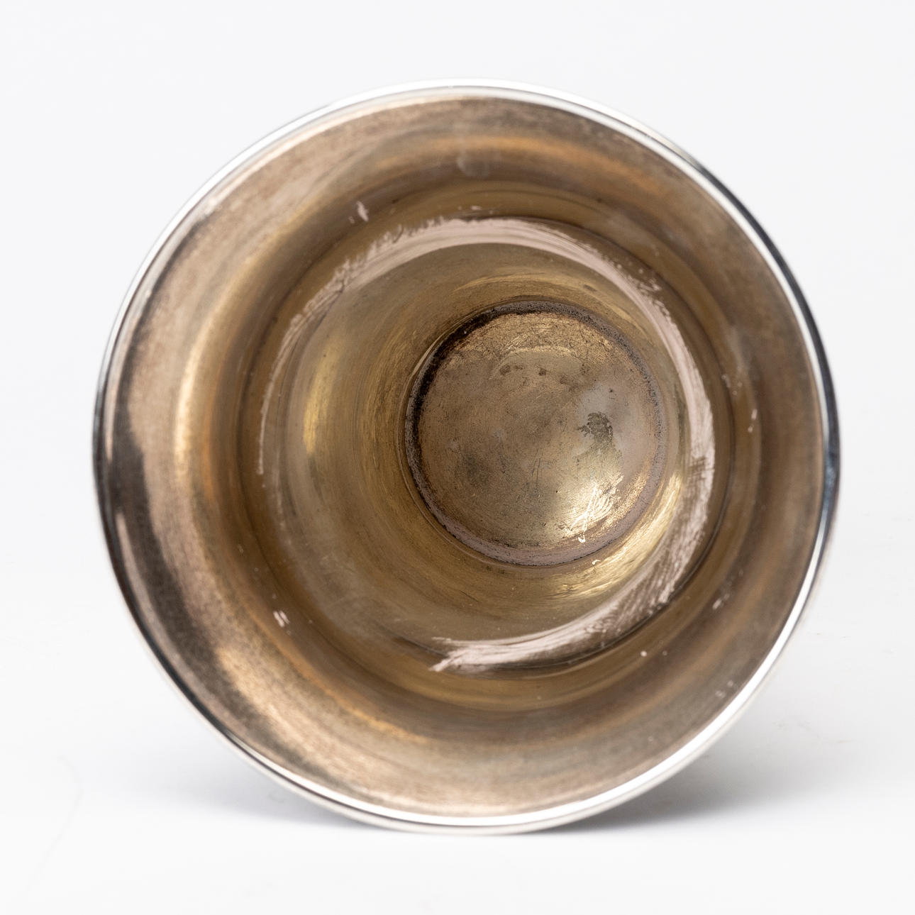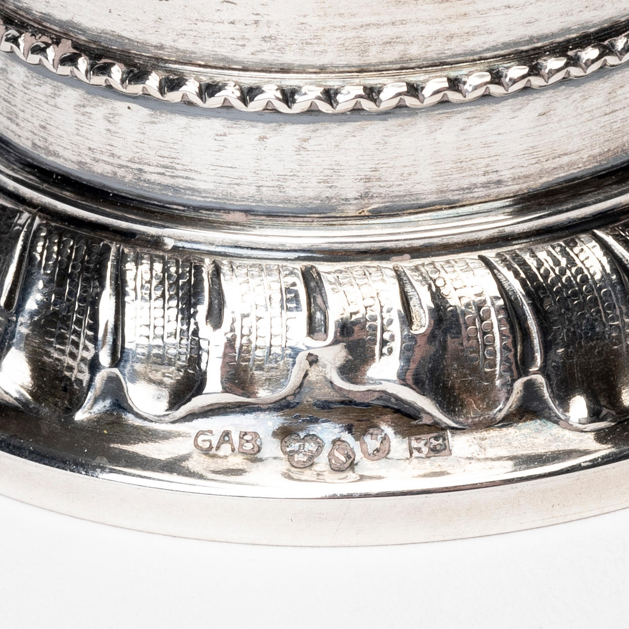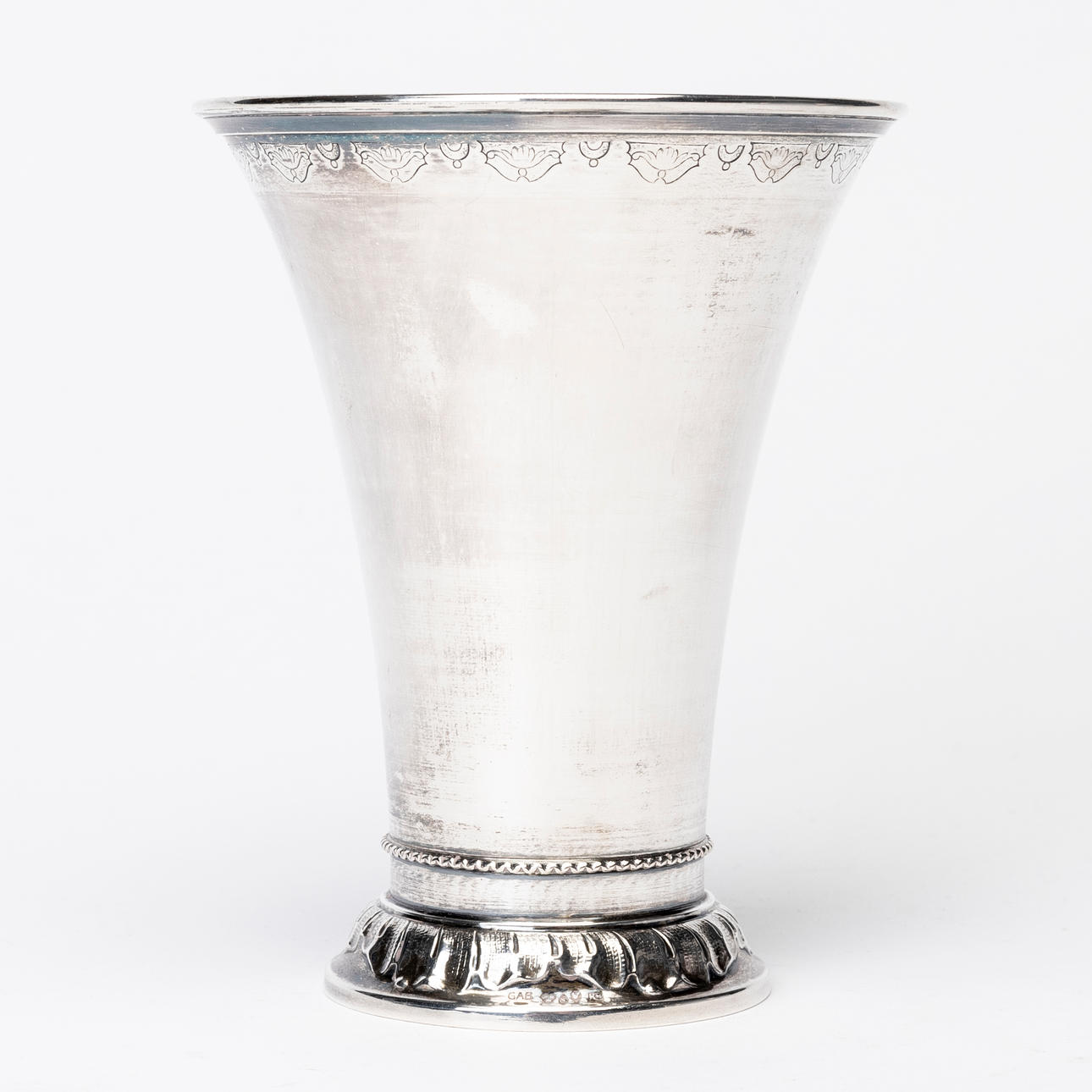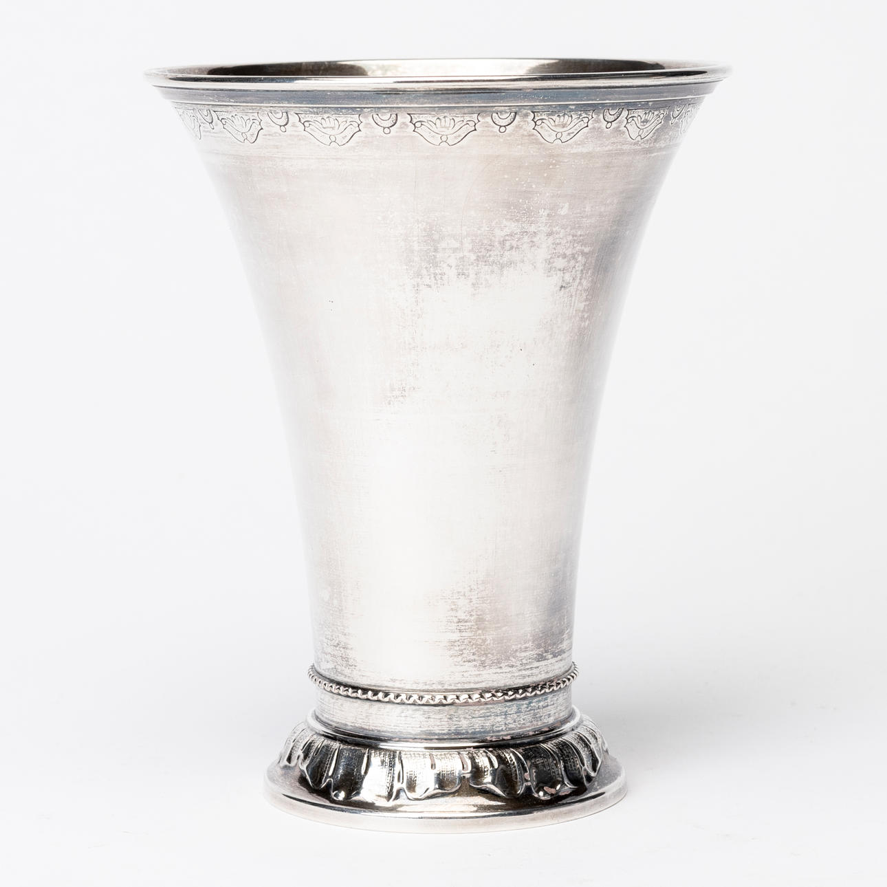 Foot with leaf-like decoration, engraved dedication at the bottom, height approx. 12 cm.