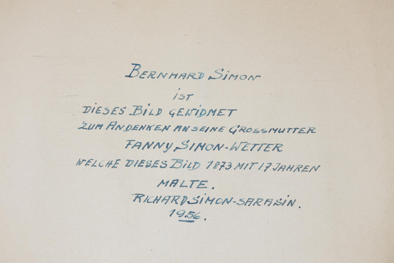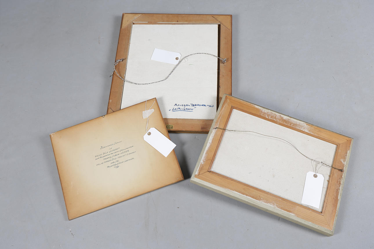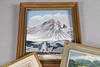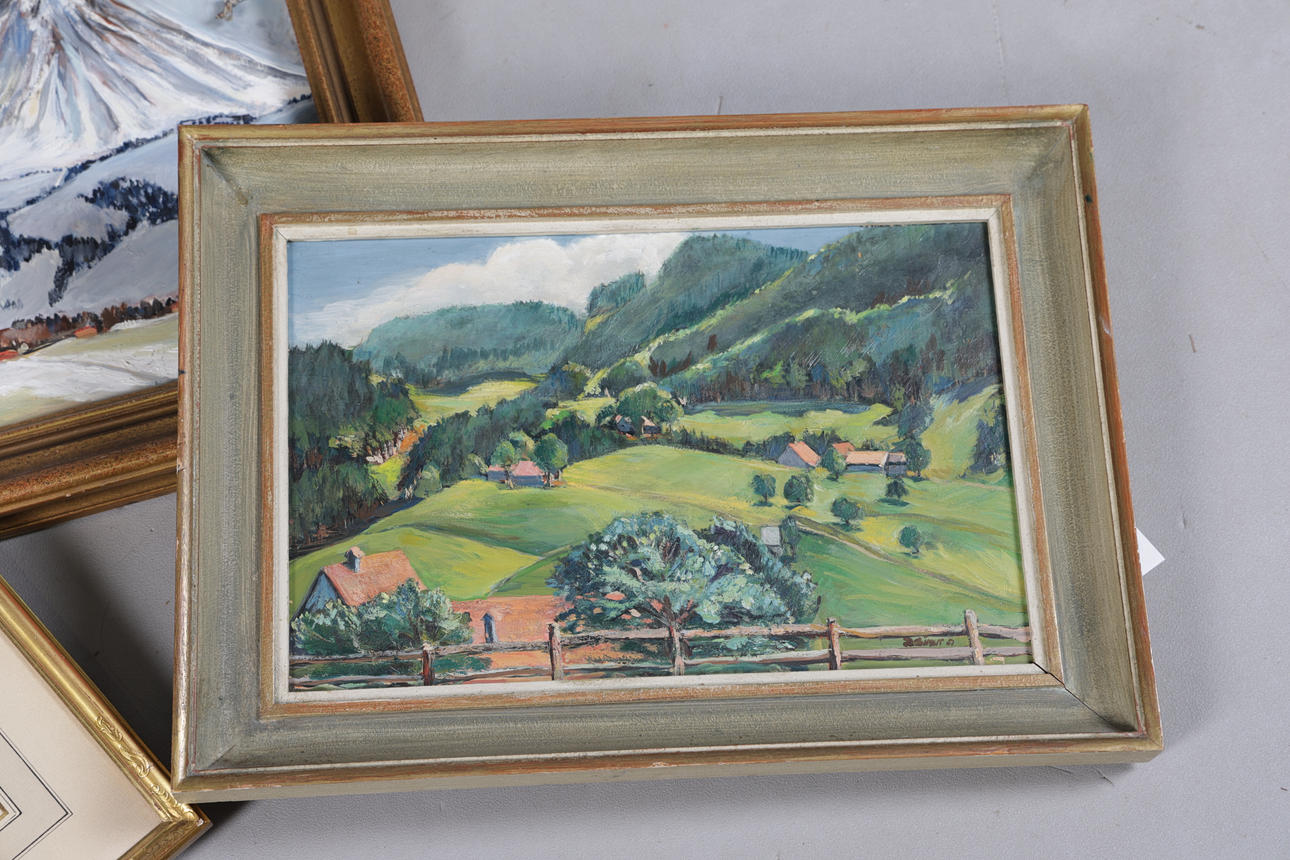 The first continental school, watercolour landscape of cattle watering, framed, with dedication to verso, 43cm wide, 34cm high including frame, together with an oil on board landscape of a valley, 50.5cm wide, 37cm high including frame, and another of a mountain signed R. Simon, 49cm wide, 57.5cm high including frame (3).