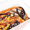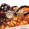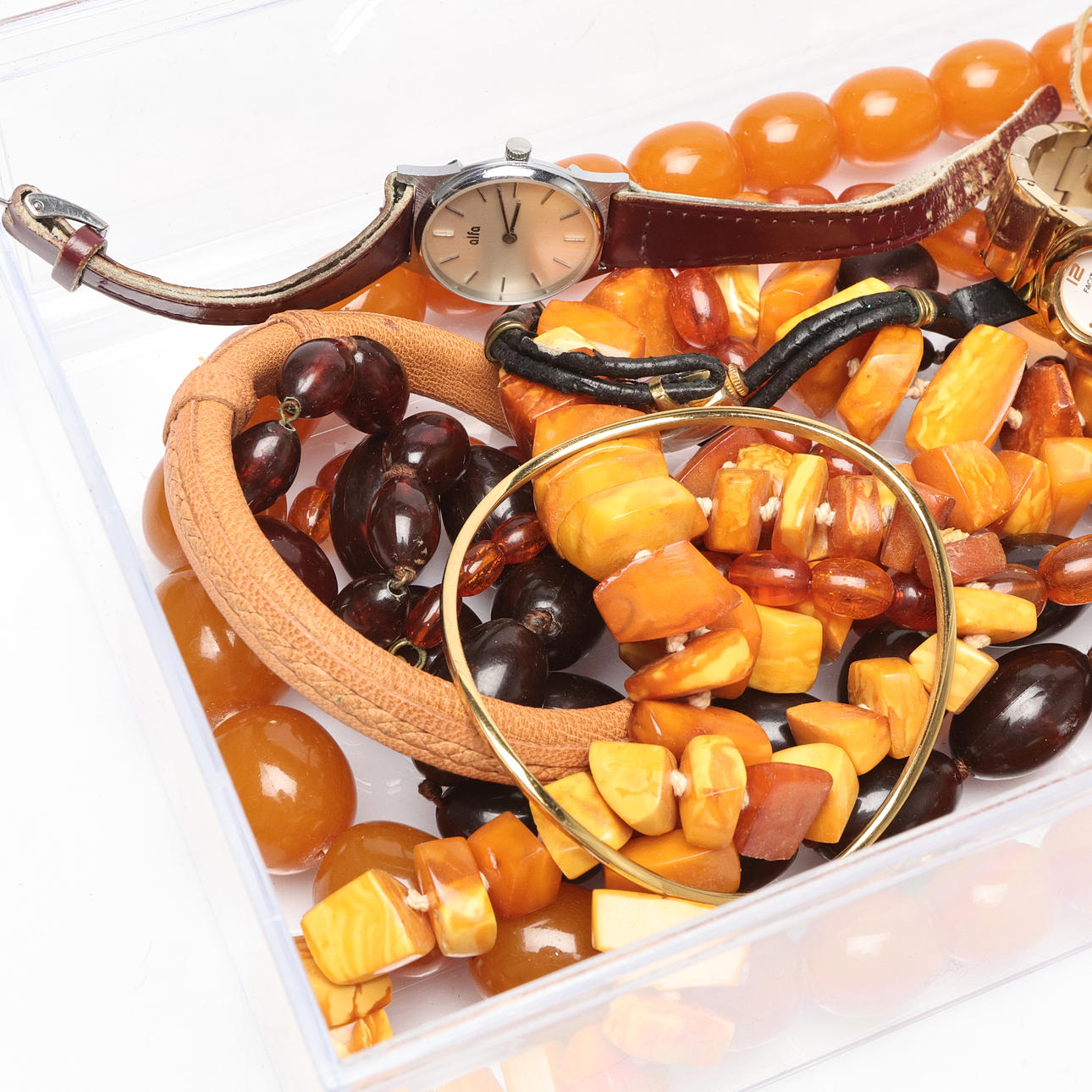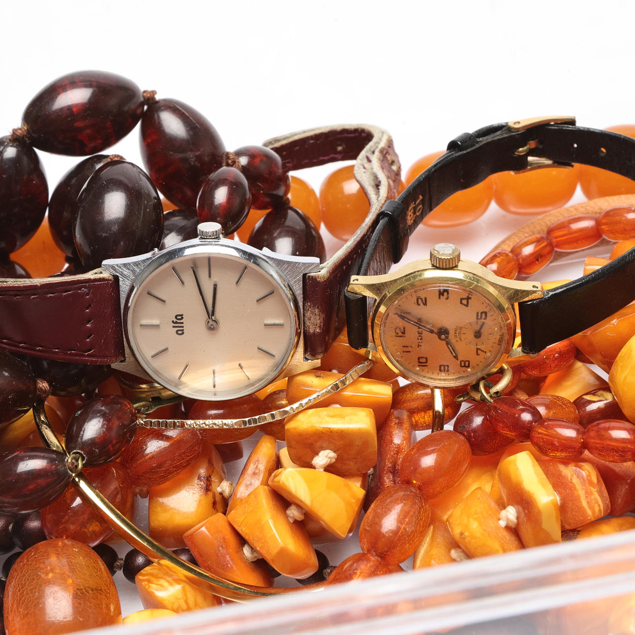 Necklaces, including amber and plastic.