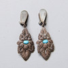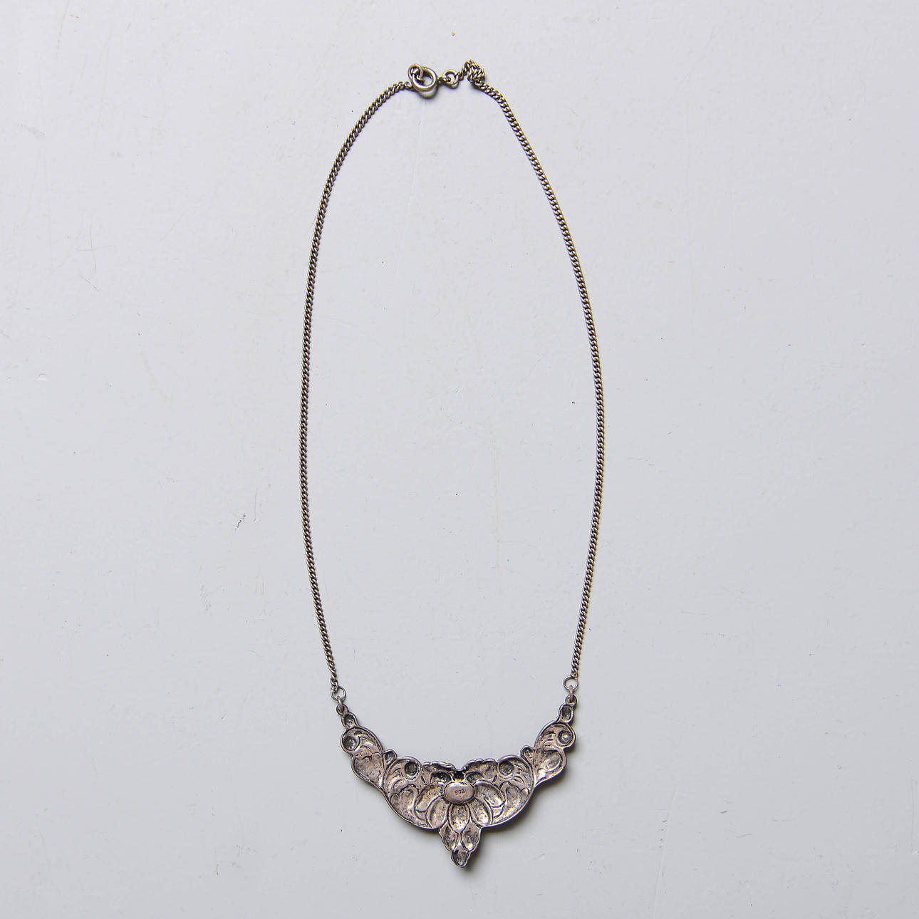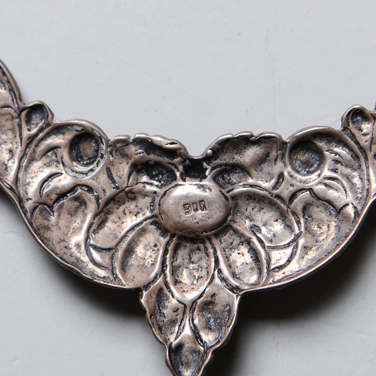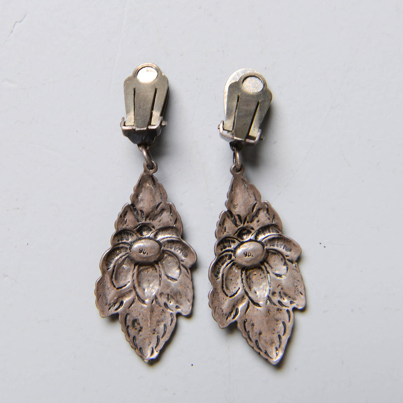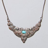 Marked 900. With turquoise stones. A pair of earrings (clips), height 6 cm. Necklace, length approx. 40 cm.