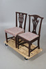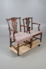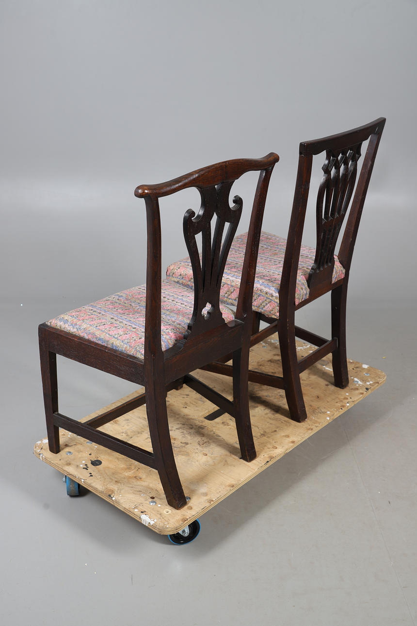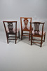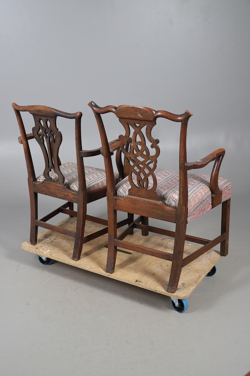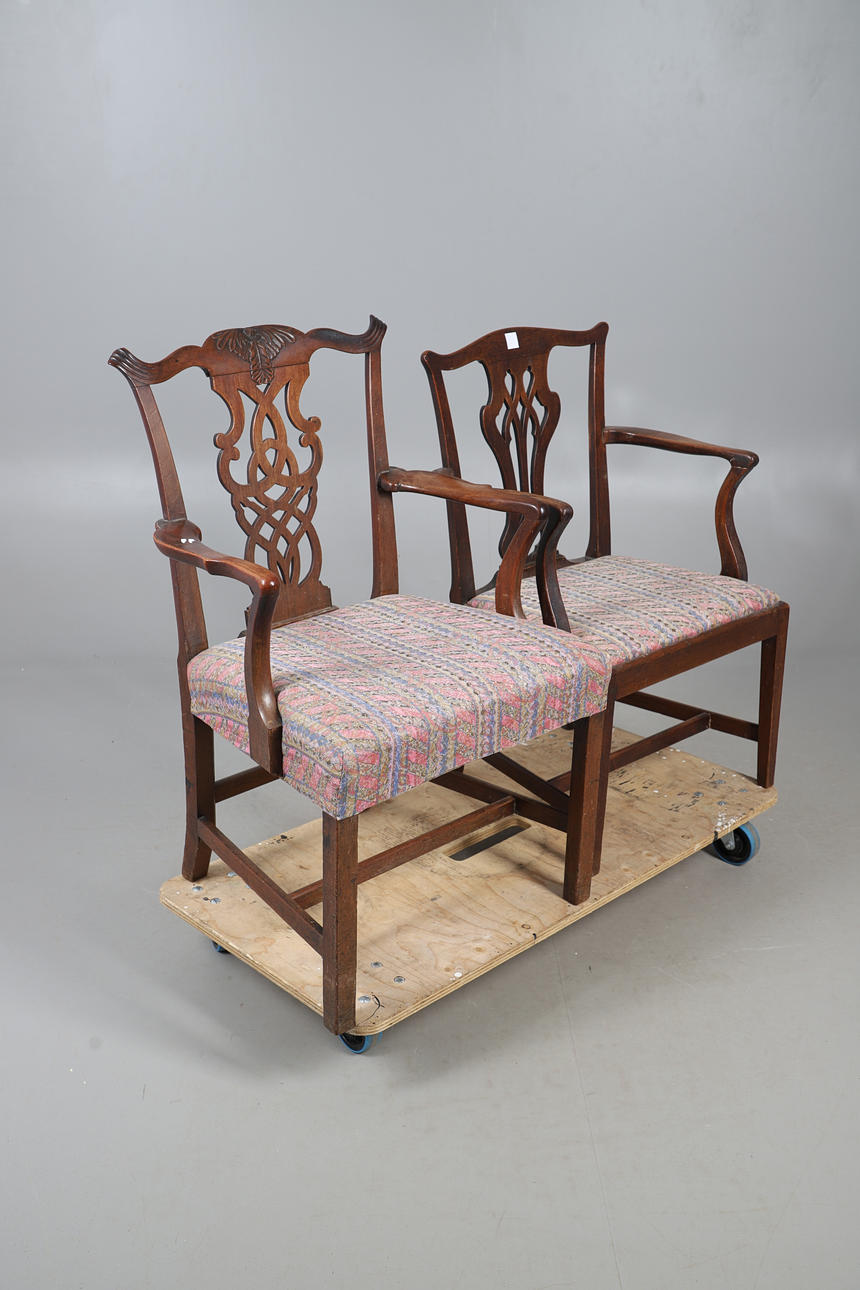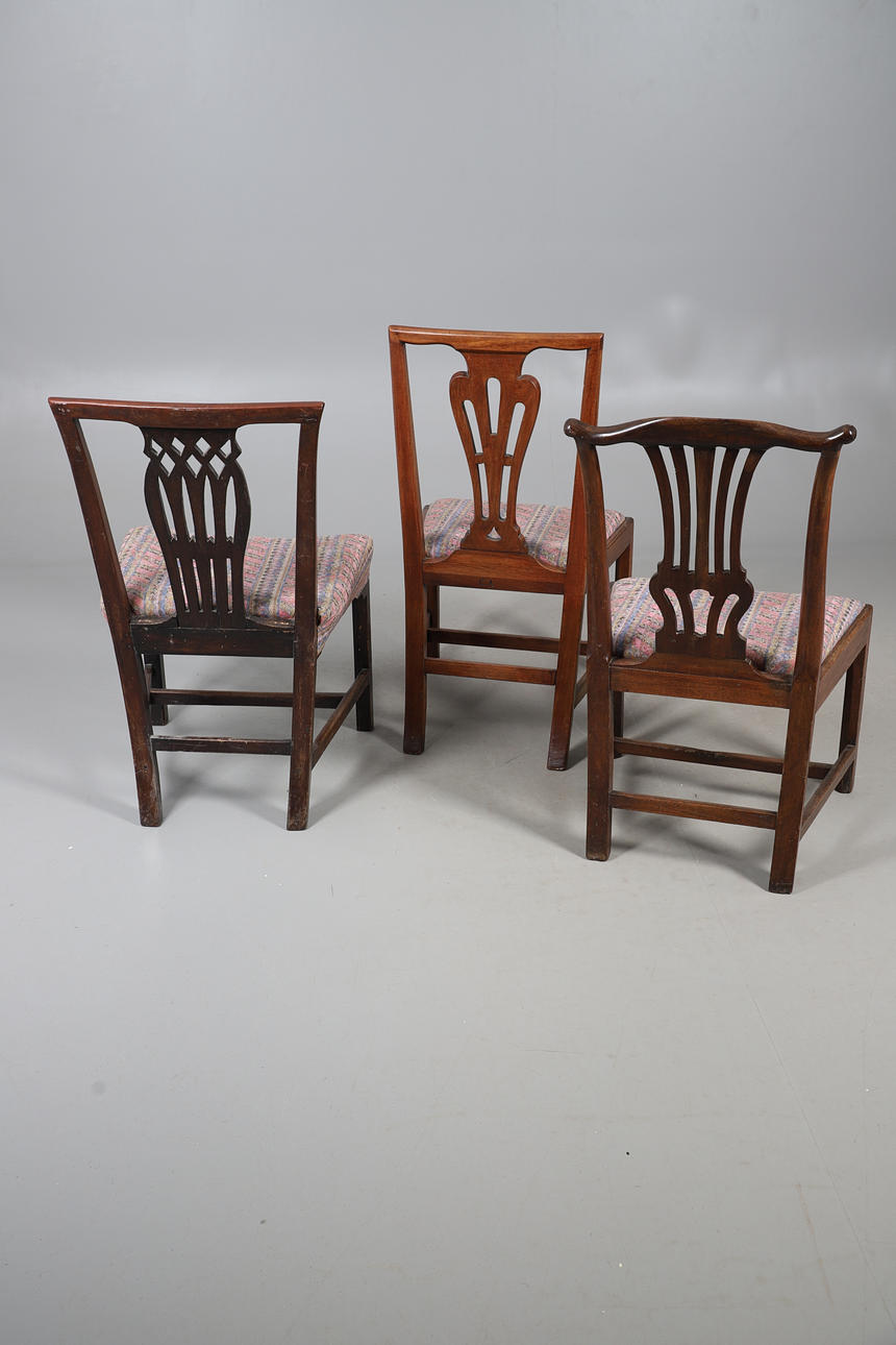 Of various styles and materials, upholstered in same fabric. To include two elbow chairs with pierced splats and moulded elbow rests, largest W63 x 100 x 54, seat H50cm (7).