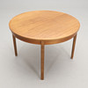 Walnut veneer. Round extendable top, diameter 110, height 73 cm.