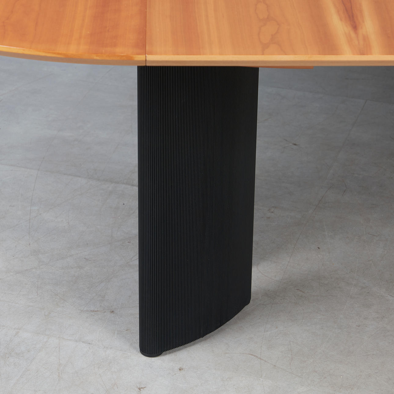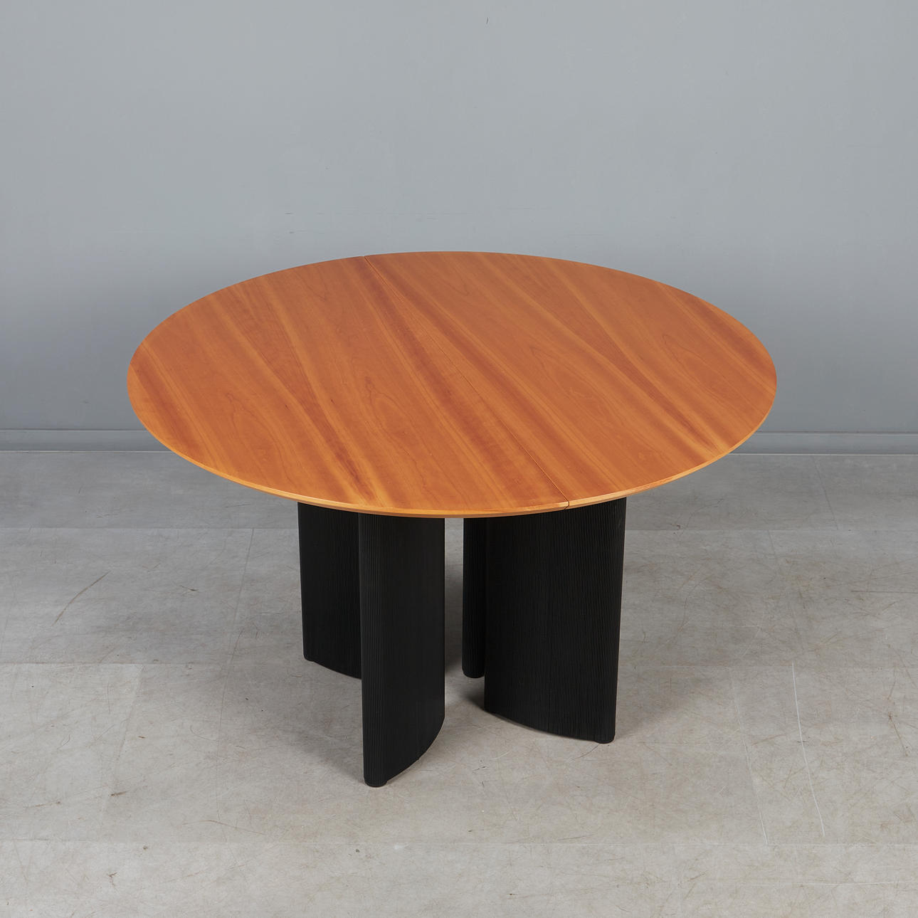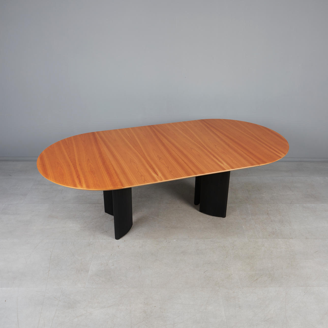Dining table with four oval table legs, black rubberized, round tabletop in glazed cherry wood, extendable with two leaves.