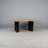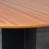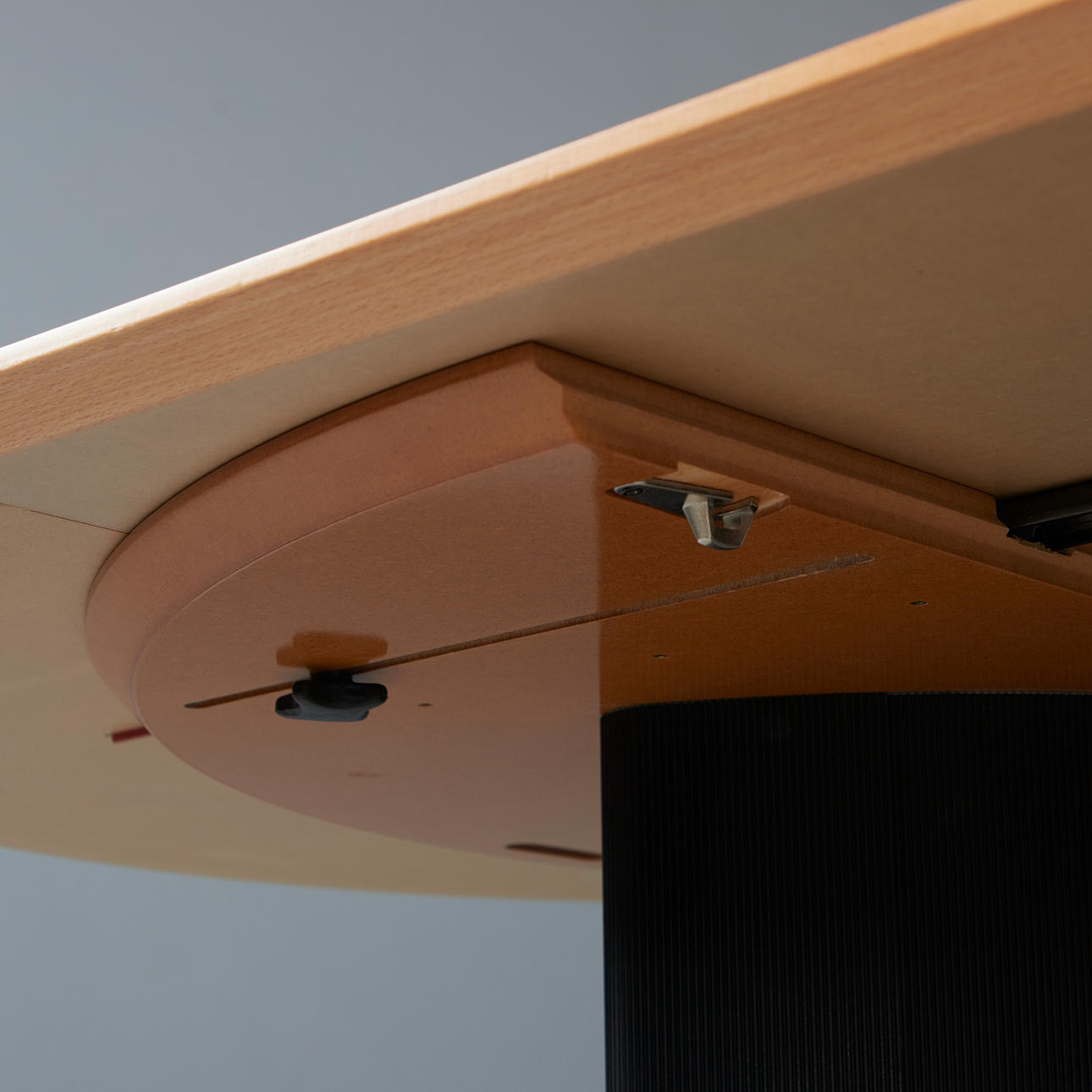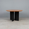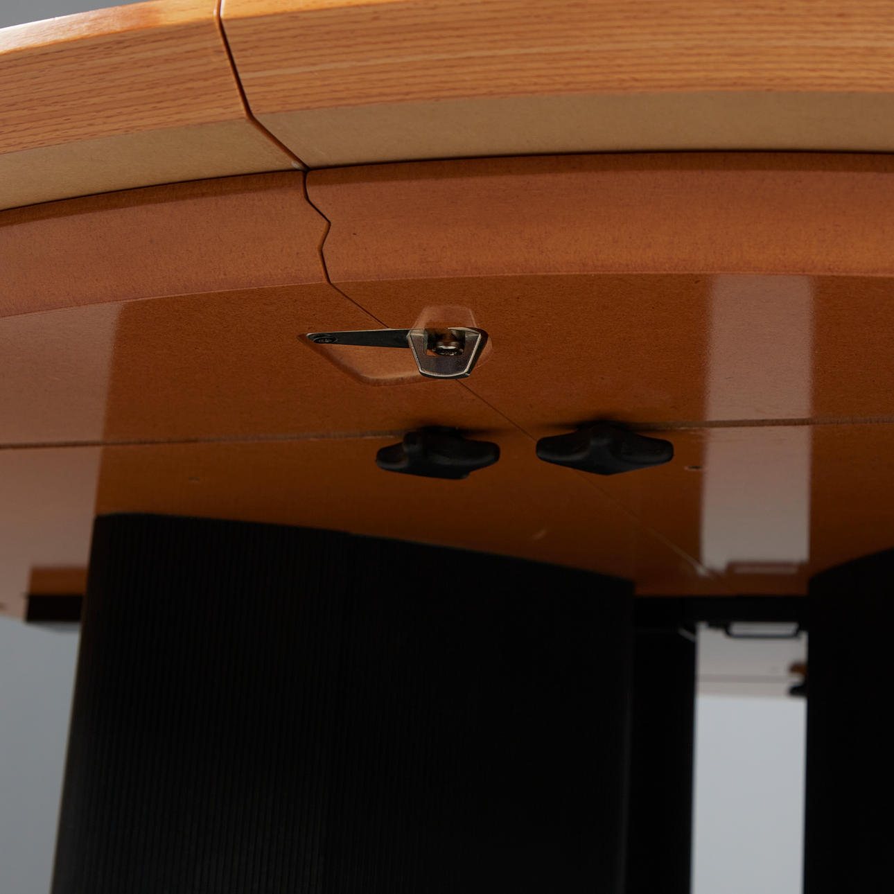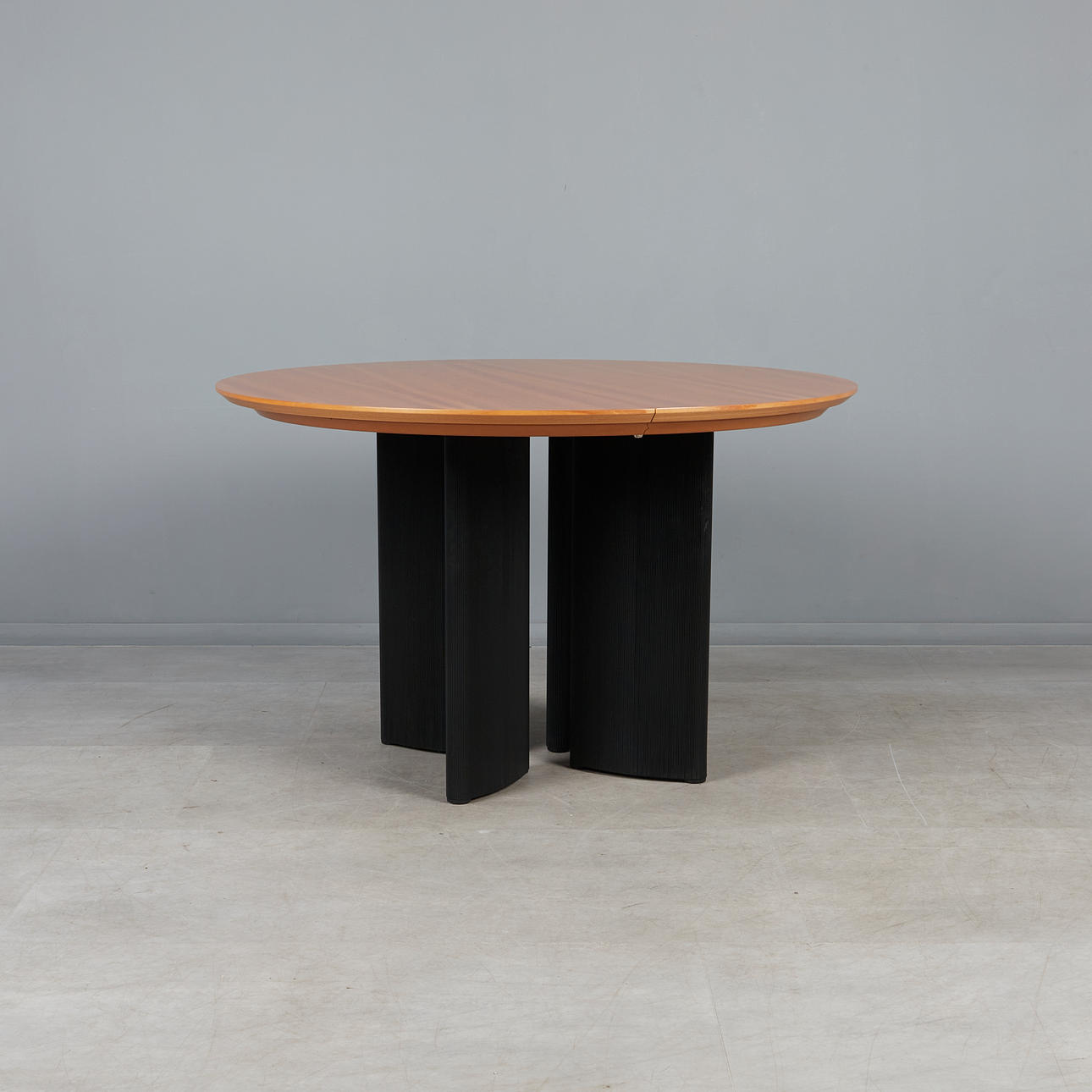 Dining table with four oval table legs, black rubberized, round tabletop in glazed cherry wood, extendable with two leaves.