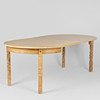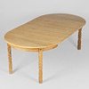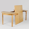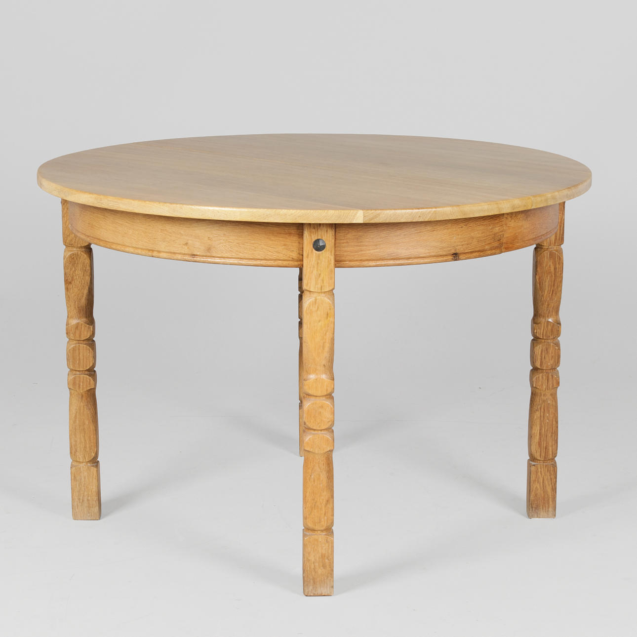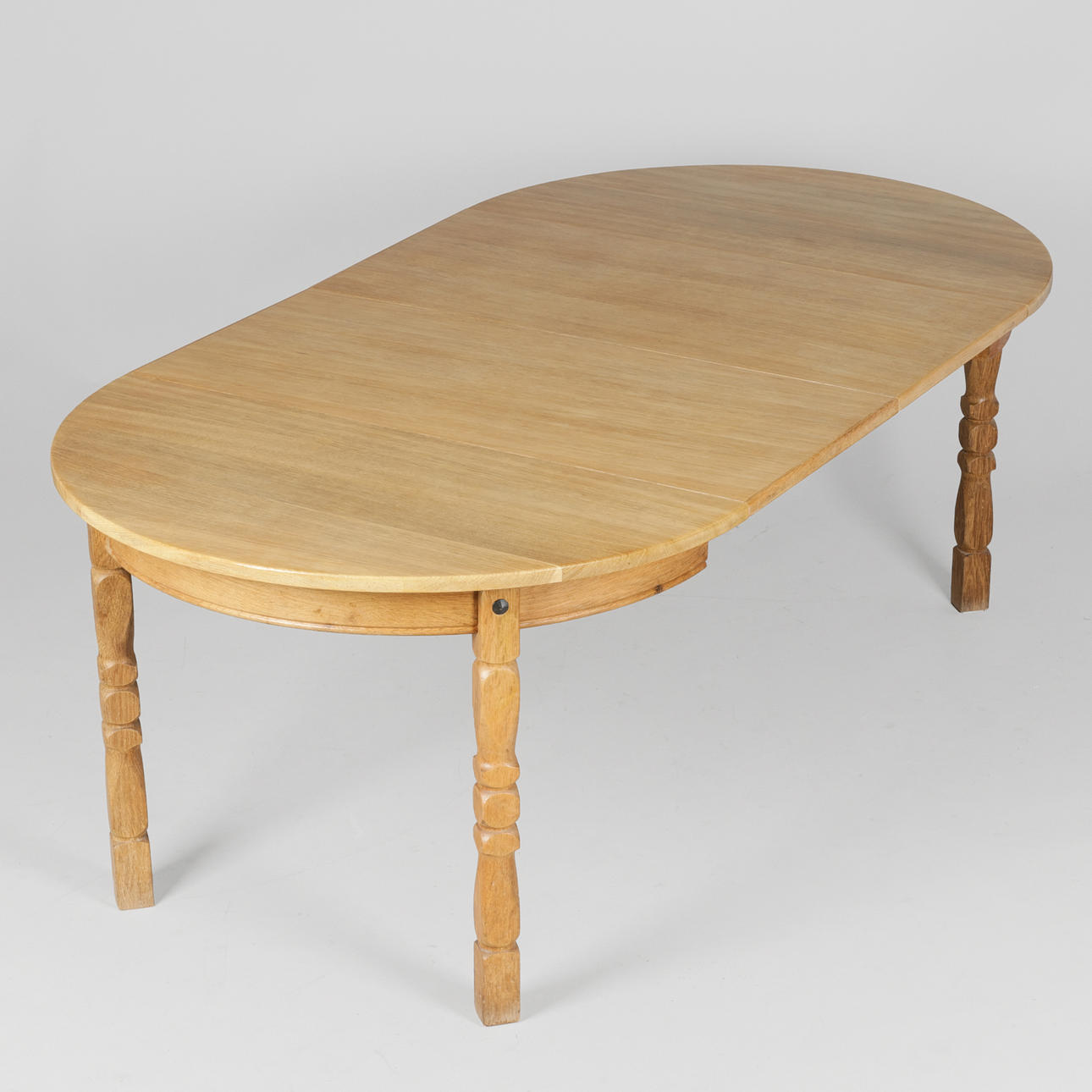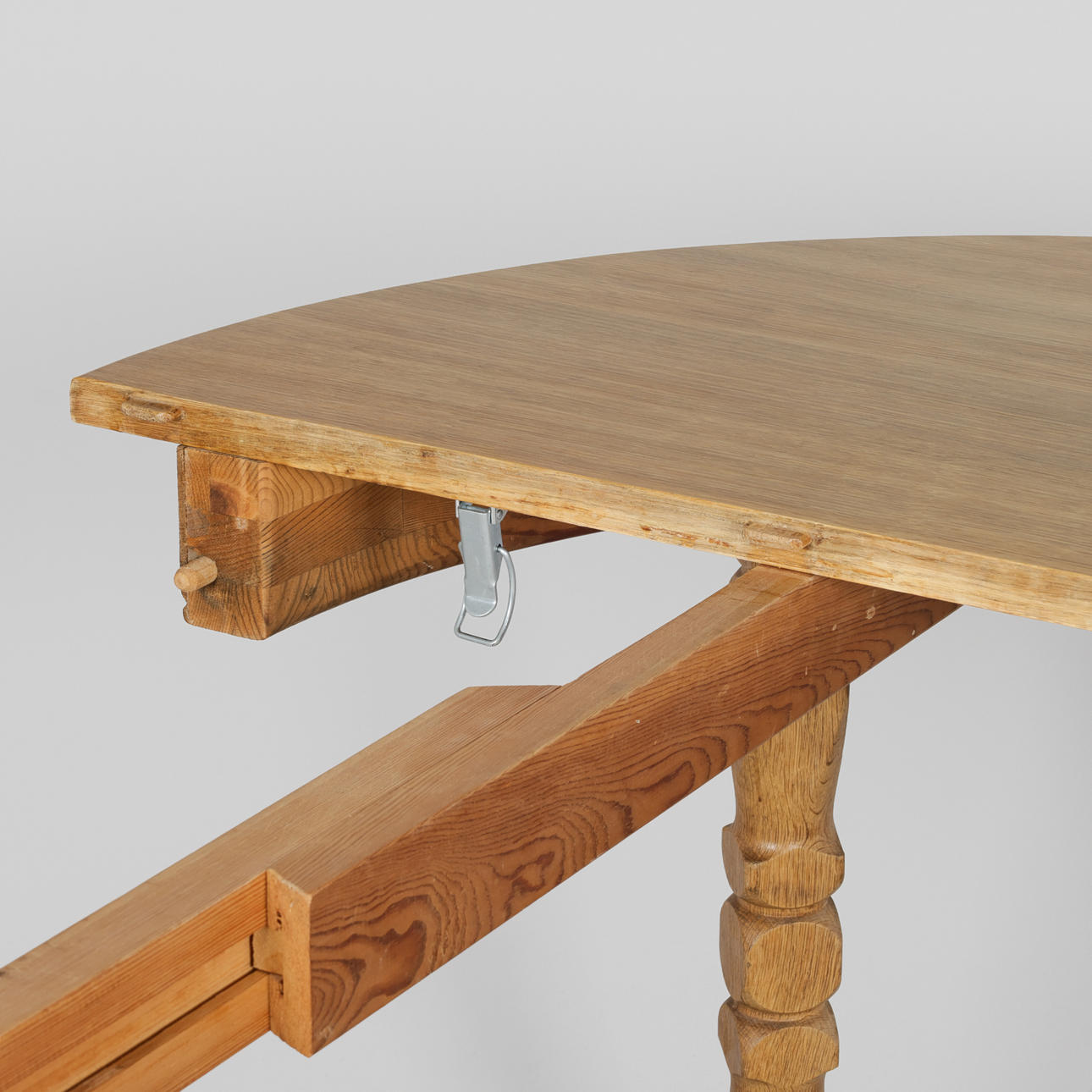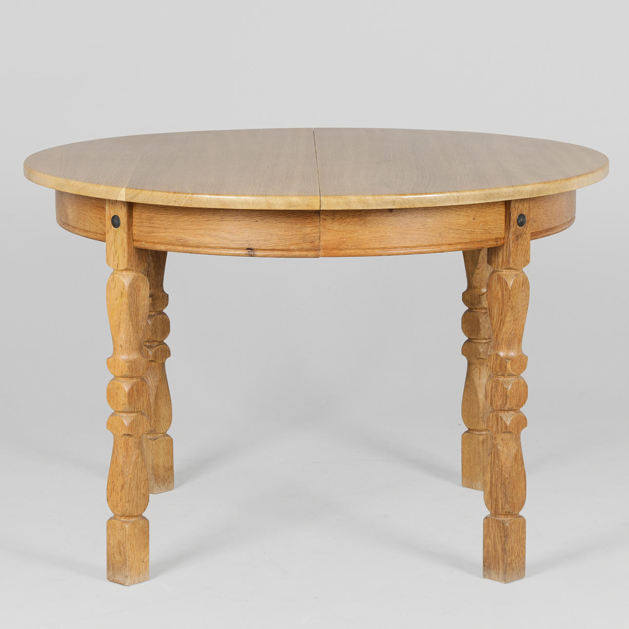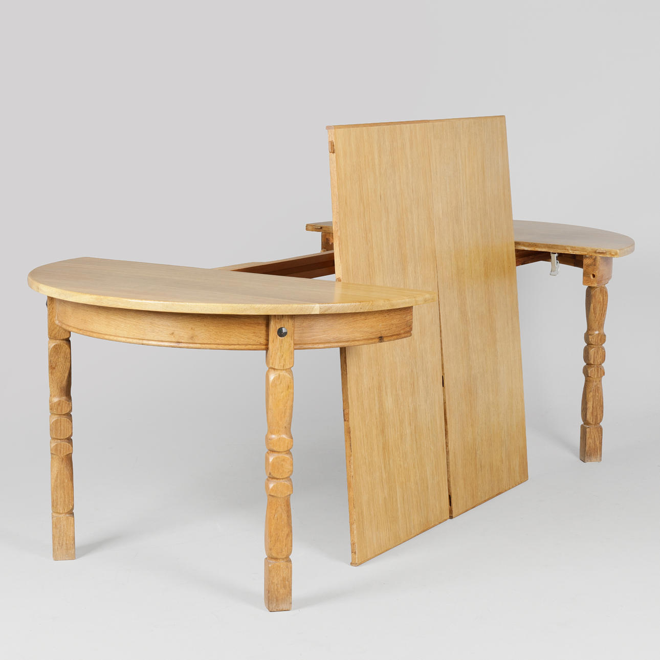 5021487. Circular dining table made of solid oak with pull-out and two additional plates, Kjærnulf-style, Danish furniture manufacturer, Denmark, circa 1960/1970s (1+2).