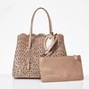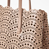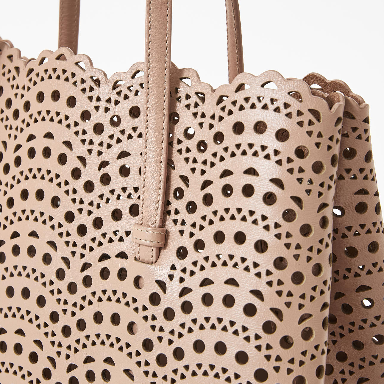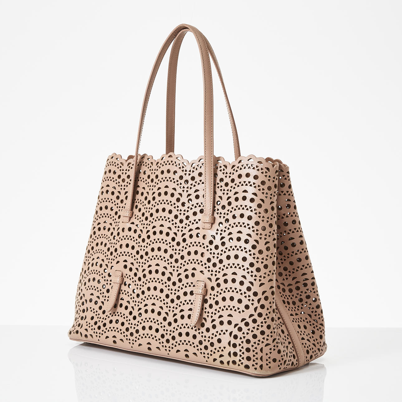 Light pink perforated leather, sides with snap buttons, interior with mirror and pochette, marked "Alaïa Paris made in italy", dimensions approx. 32 x 26 x 16 cm.