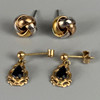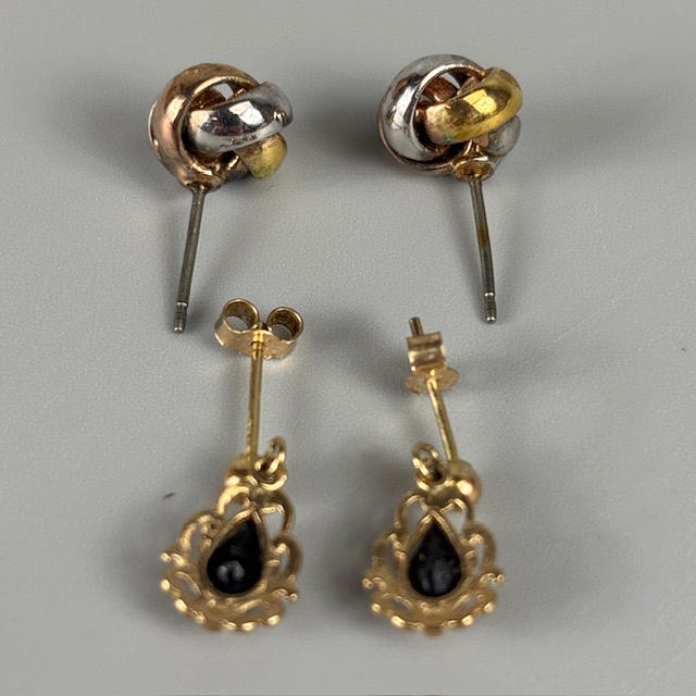 Pair of yellow metal earrings each set with a teardrop stone, and a pair of three colour knot earrings, total 4.4g.
