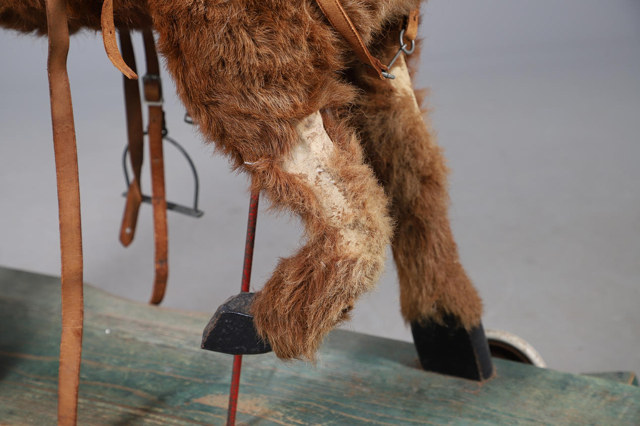 The horse on a painted wooden rocker. 101.5cms high, base 127cms long.