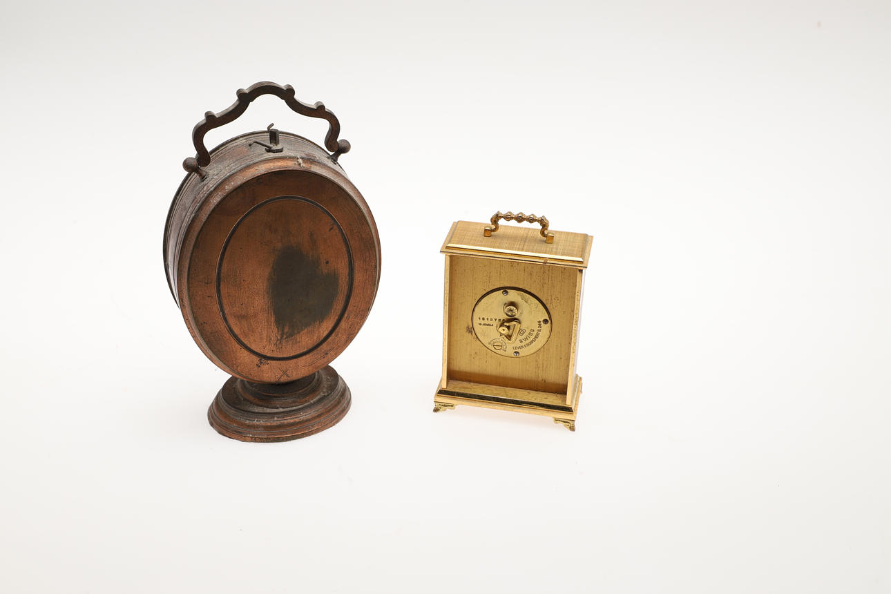 An unusual desk clock and barometer, with two enamel dials and two temperature gauges on each side, in a metal case (glass broken, 21cms high). Also with a small gilt metal Swiss clock (13cms high). (2).