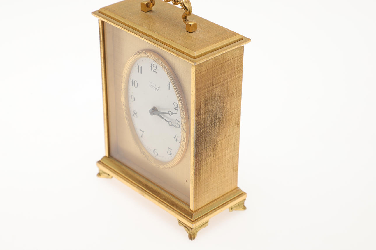 Desk clock, glass broken, one dial with chip, not tested for function.