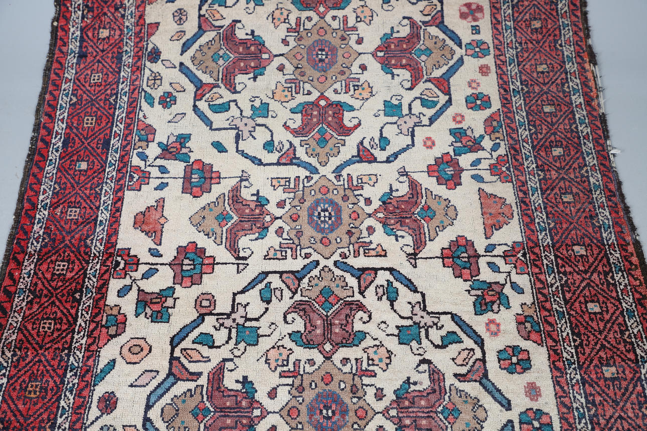 the geometric and floral motifs on ivory ground, within multiple borders, 110cm x 185cm.