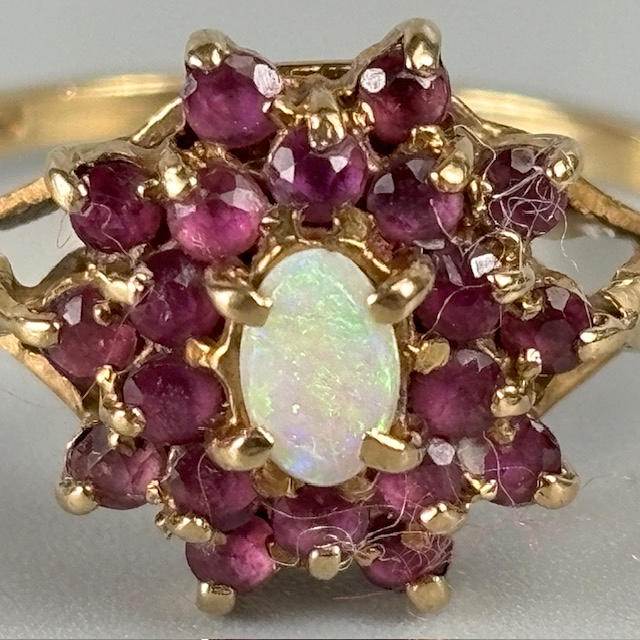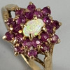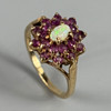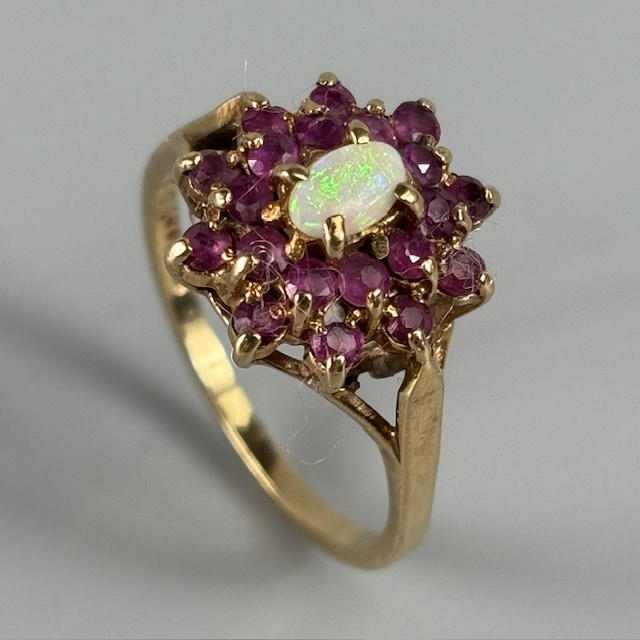 9ct gold hallmarked ring set with a central opal surrounded by rubies, approximately 2.6g, size N.