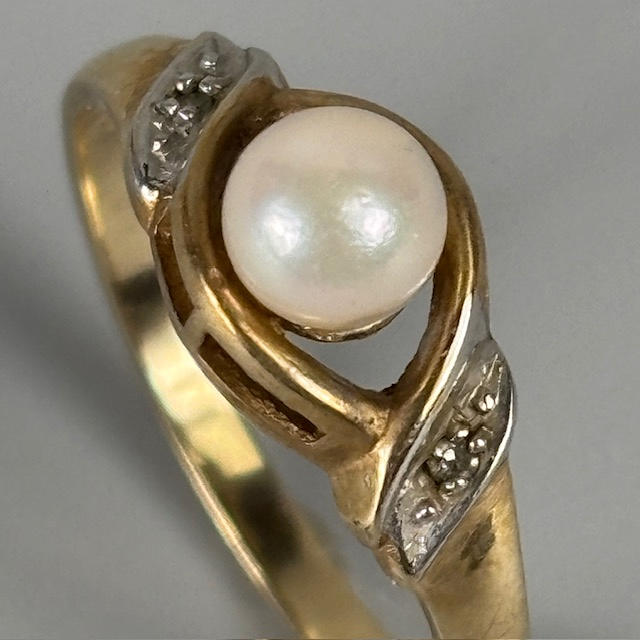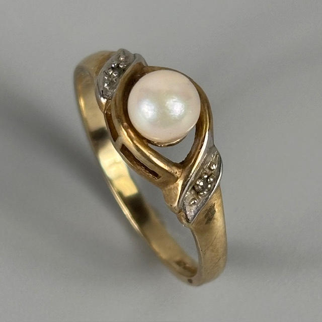 9ct gold ring set with a single pearl and two white stones, approximately 1.8g, size M.