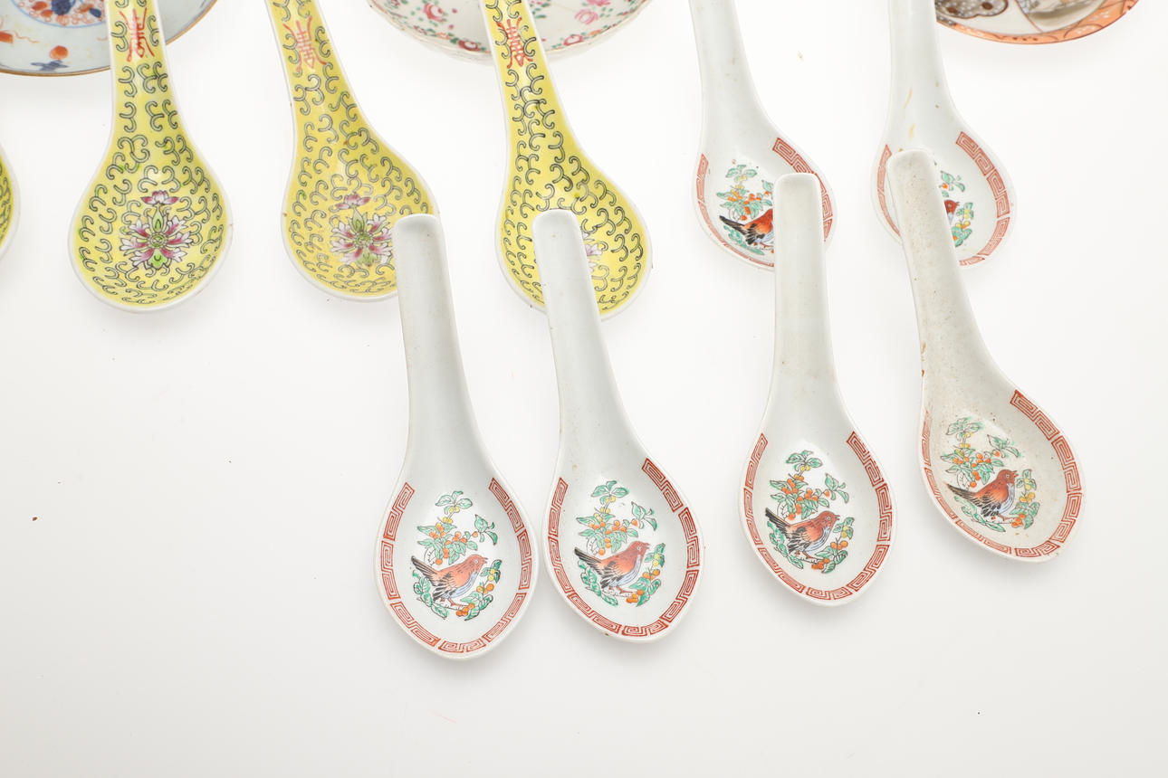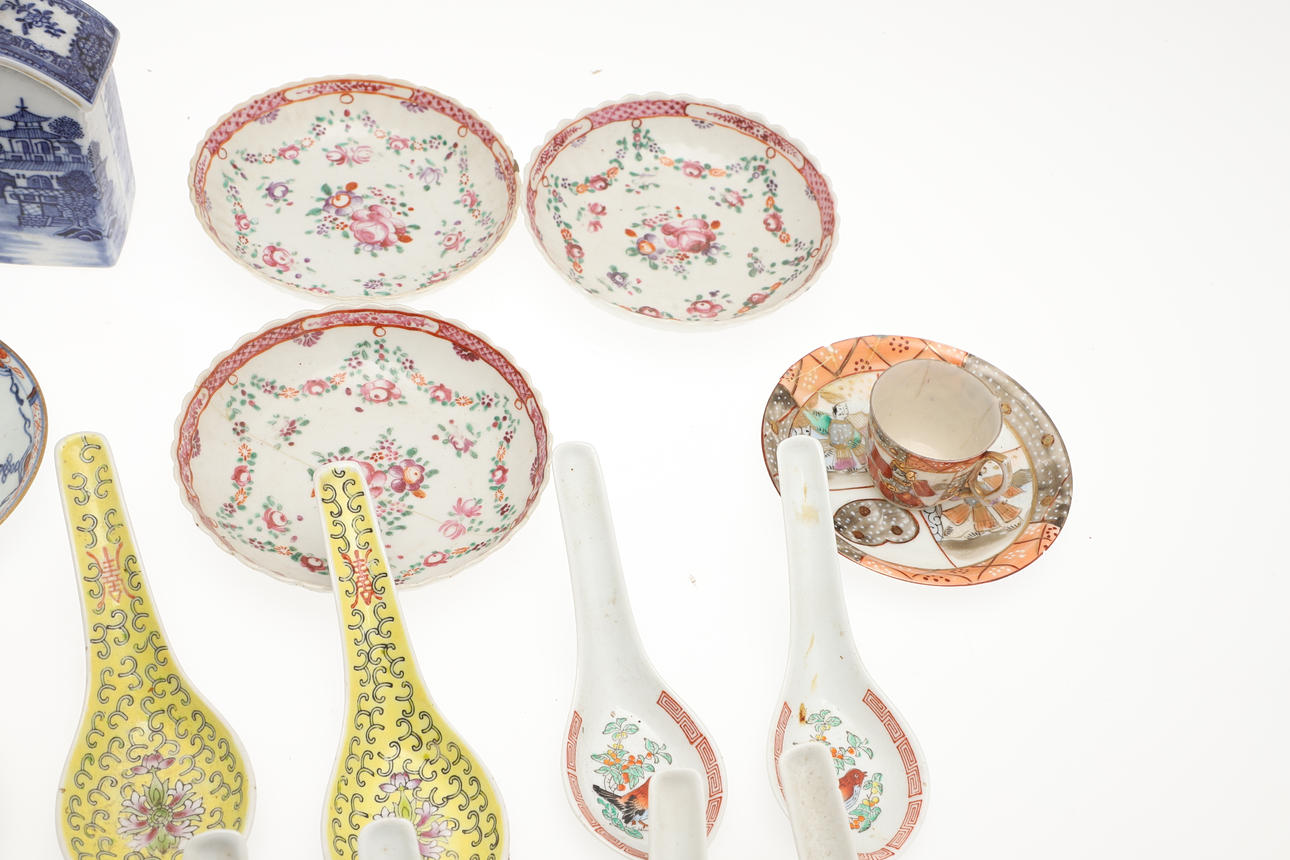 Including a blue and white tea caddy (12.5cms high), Imari saucers and matching tea bowl, and other oriental items.