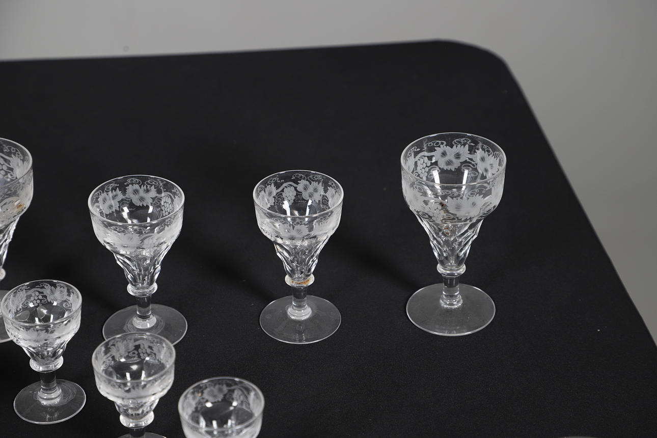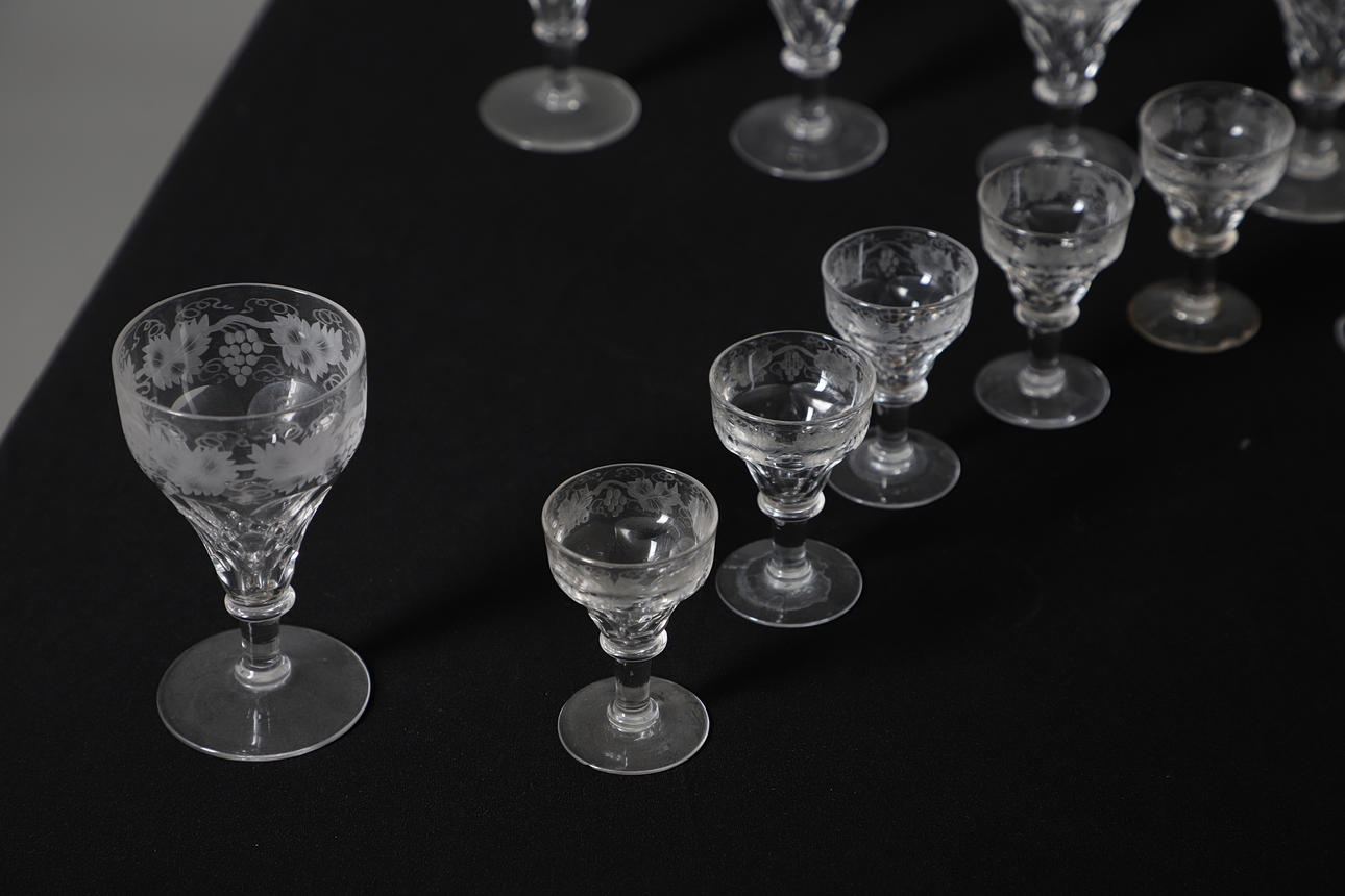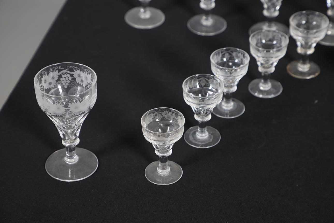 of various sizes and types, each with etched vine decoration, the largest 12cm high (qty).