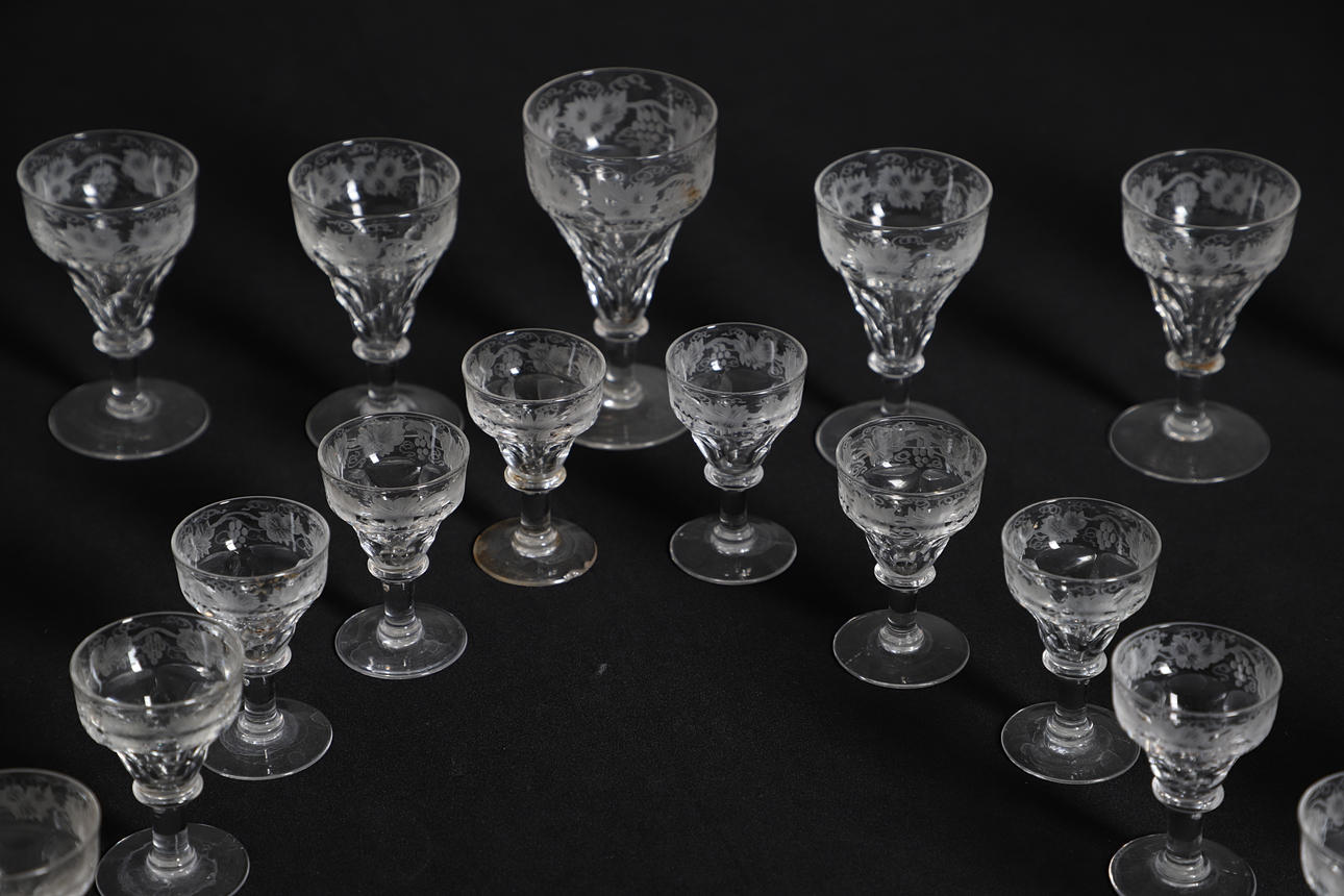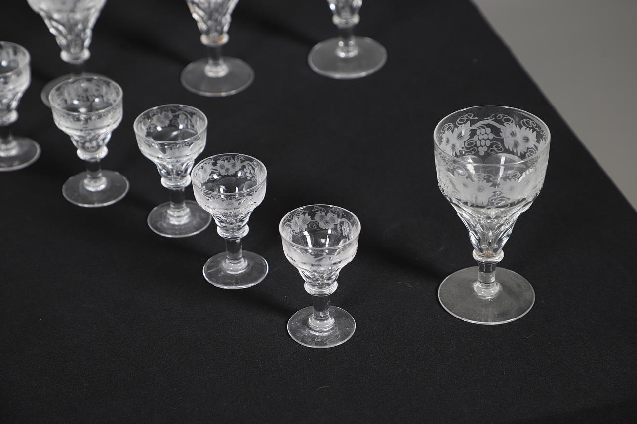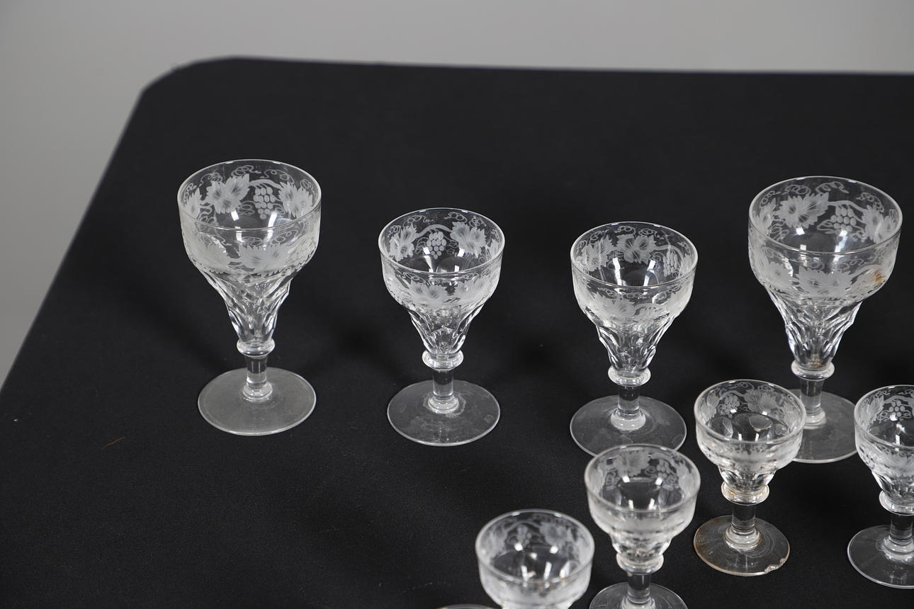 of various sizes and types, each with etched vine decoration, the largest 12cm high (qty).