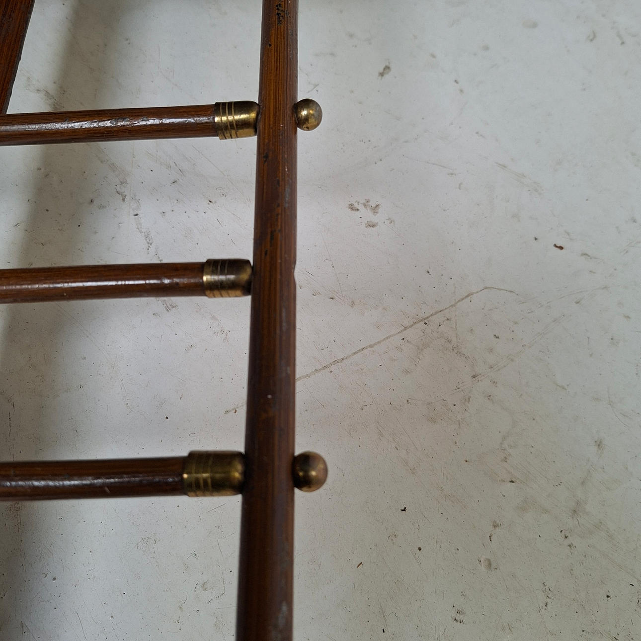 Wear, paint loss. One finial/screw missing. One headboard/footboard, finials replaced with screws.