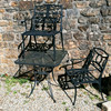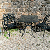 Square black metal table and 2 armchairs 71cm x 71cm x 73cm high.