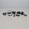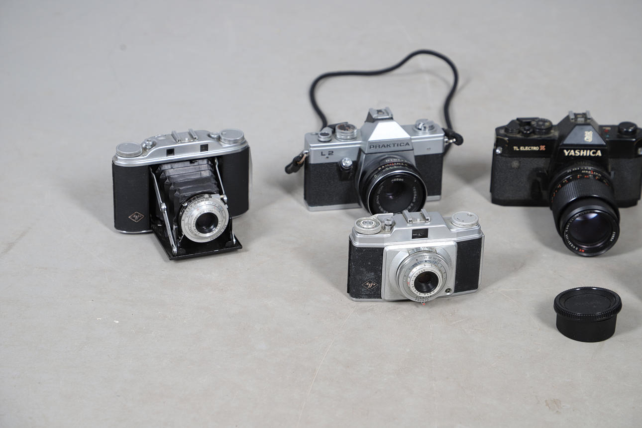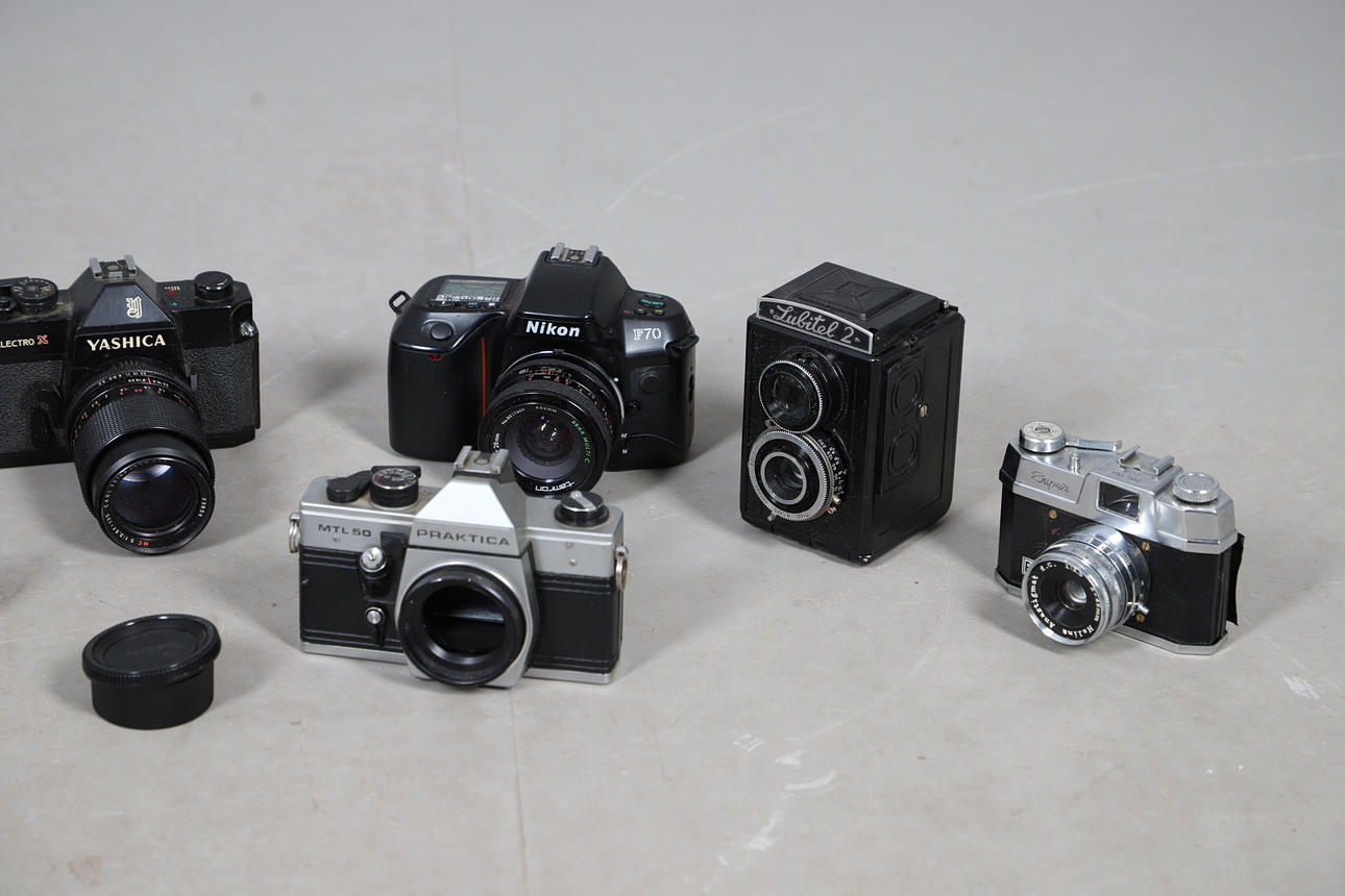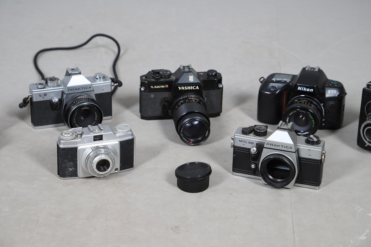 Various vintage cameras and lenses, including a Yashica TL Electro camera and Zeiss lens, Practica L2 camera and Zeiss Jena lens, Nikon F70 camera and 52mm lens, Praktica MTL 50, etc. Box for postage, 35cms by 35cms by 35cms.