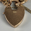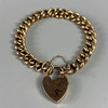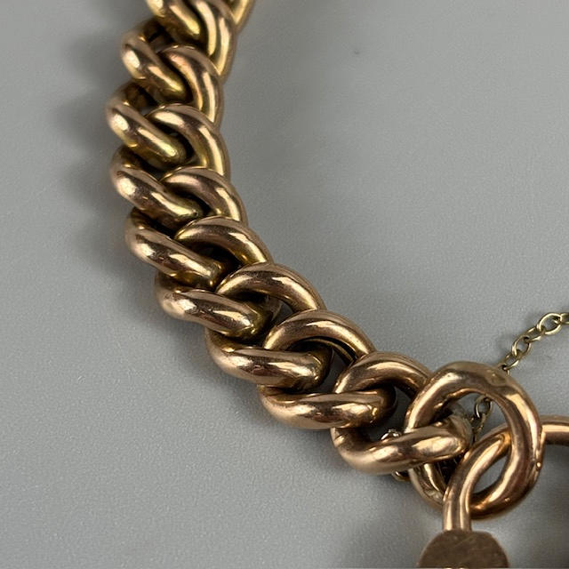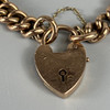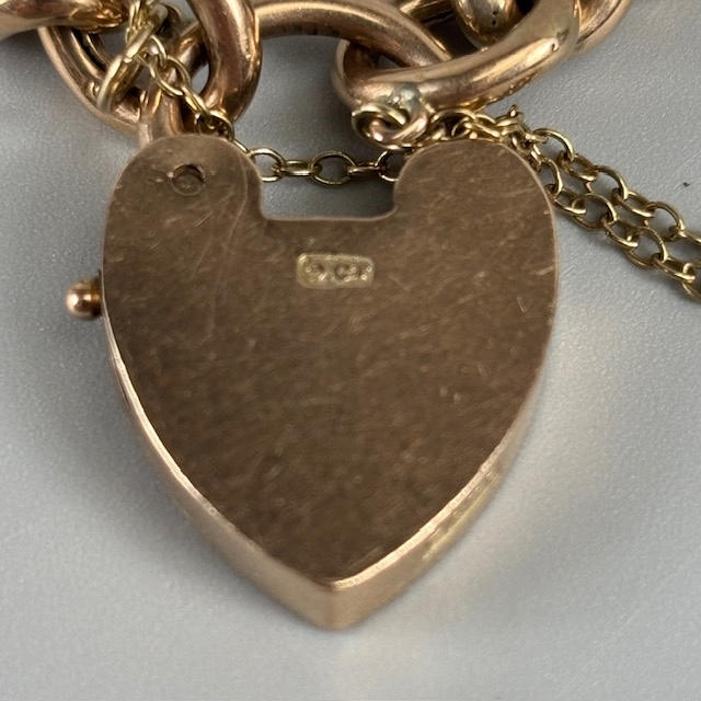 Antique 9ct rose gold charm bracelet with heart lock, approximately 18.4g.