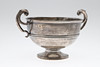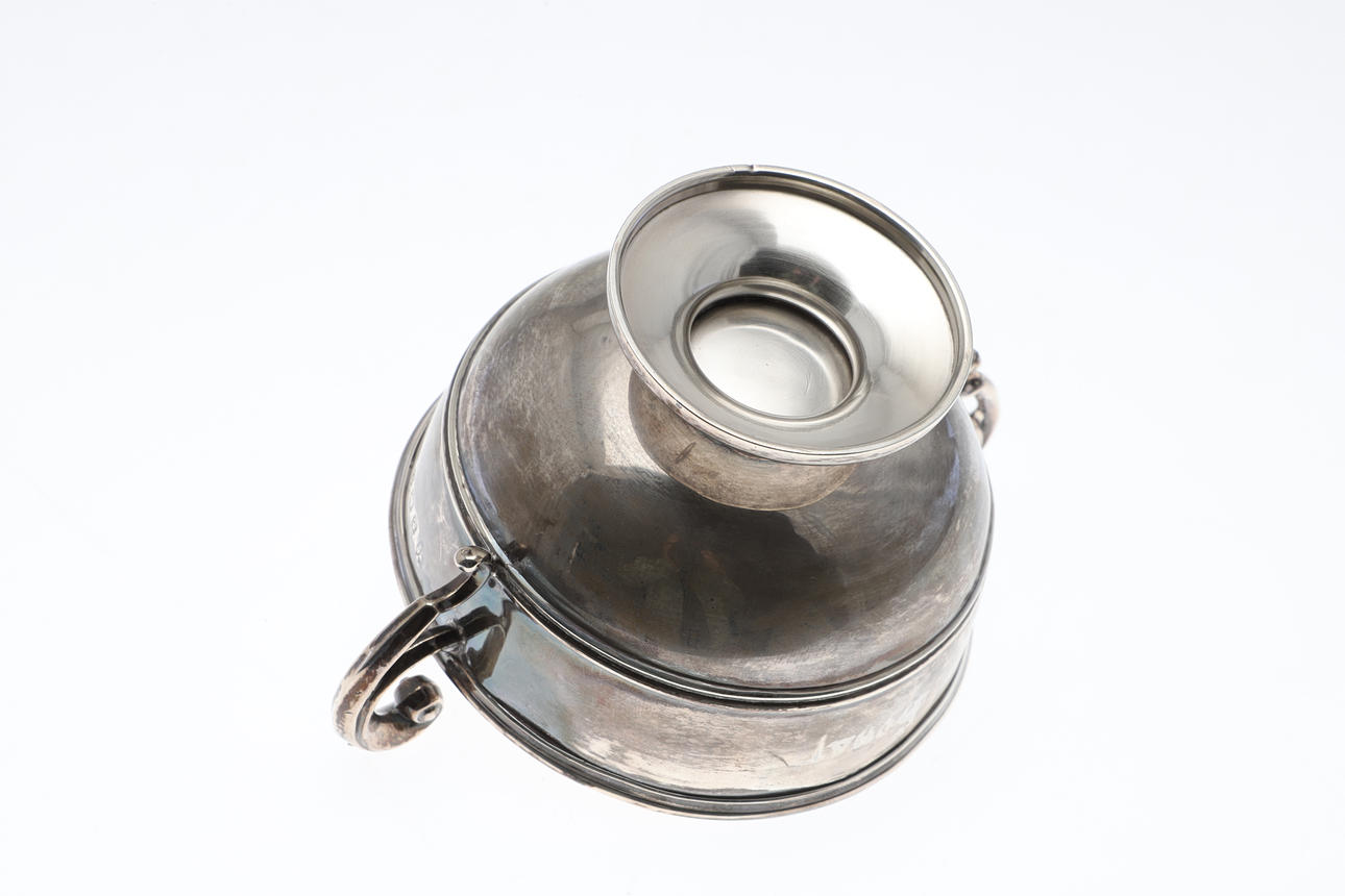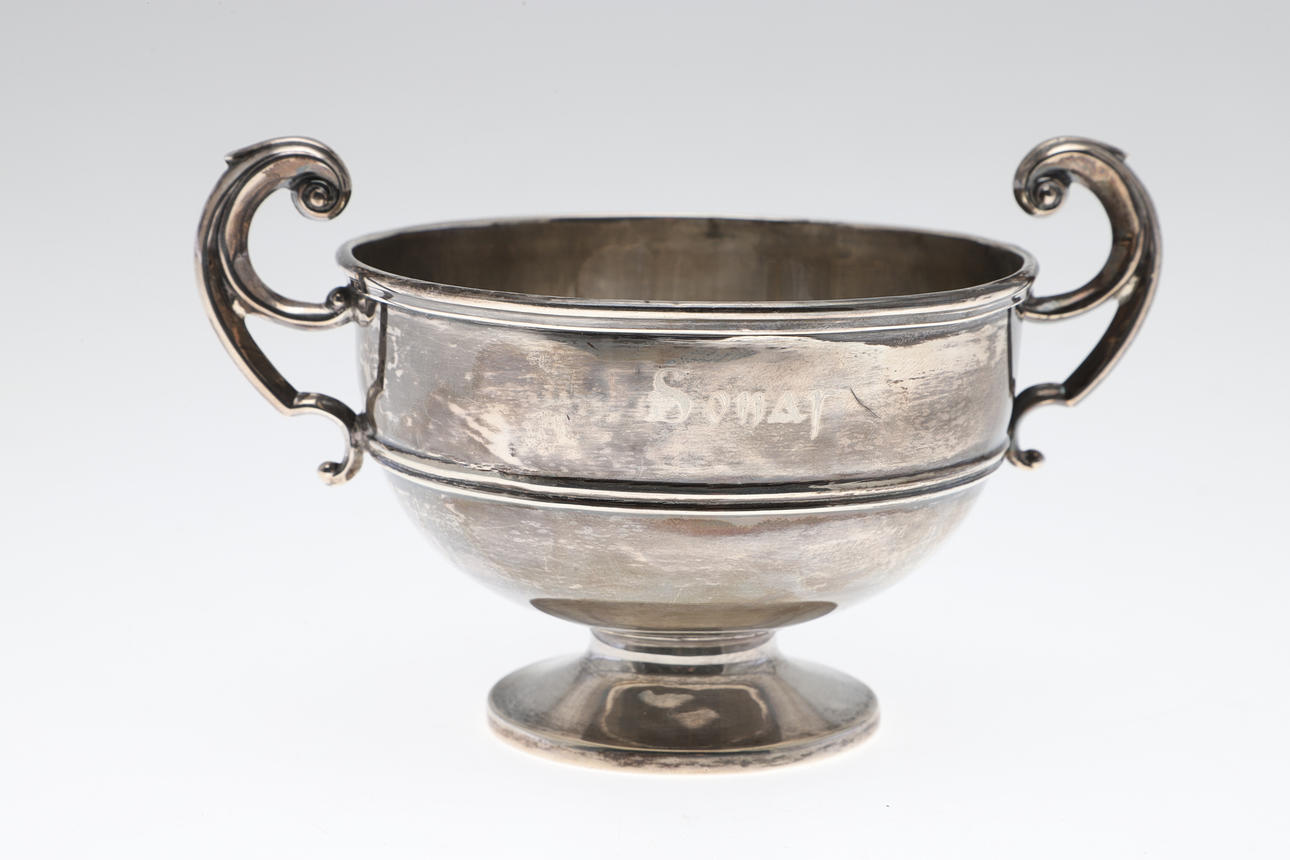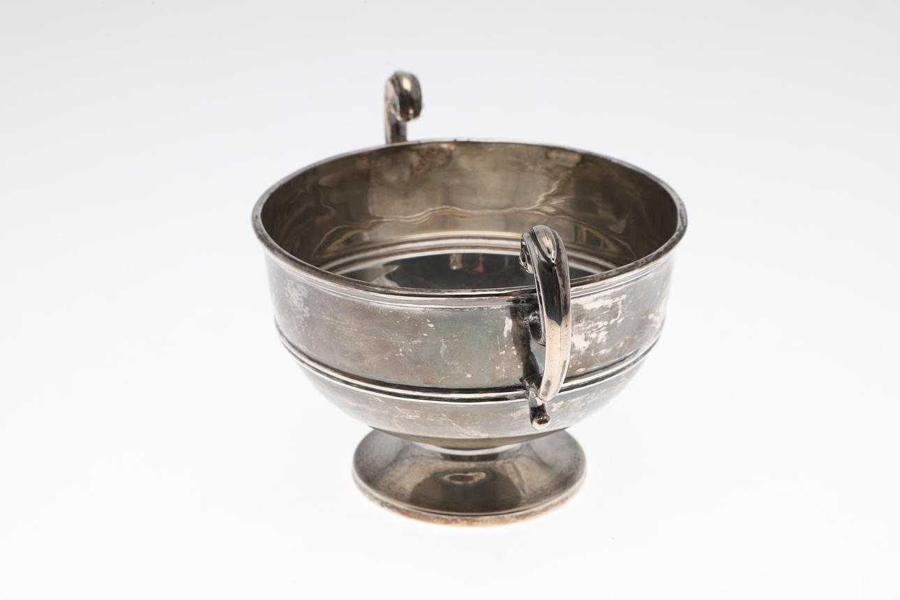 With scroll handles on a round foot, engraved wording appears to have been erased. Hallmarked Williams (Birmingham) Ltd, Birmingham, 1906. Height 9cm x Width 14cm, weight 4.4ozt.