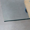 Rectangular glass table with a braced metal frame with conical legs and a loose glass top, black plastic protector, h.44cm, L.130cm, W.80cm.