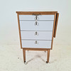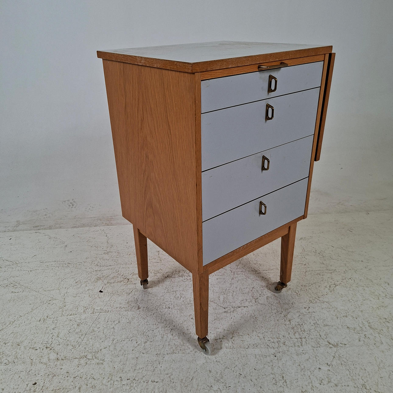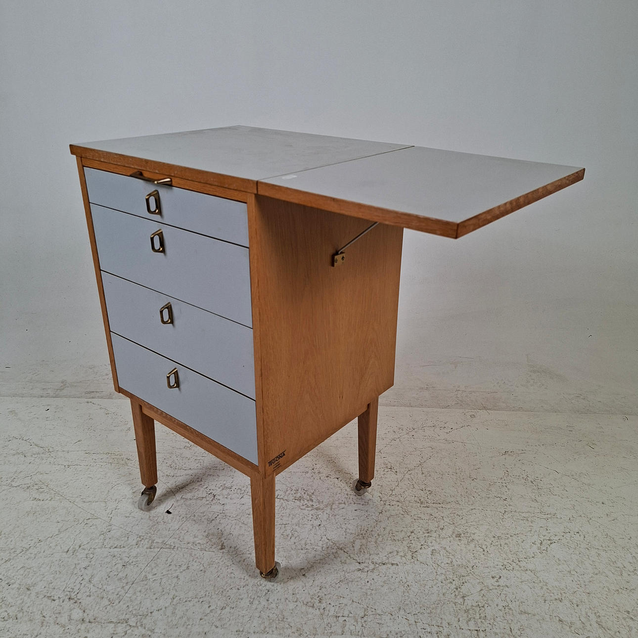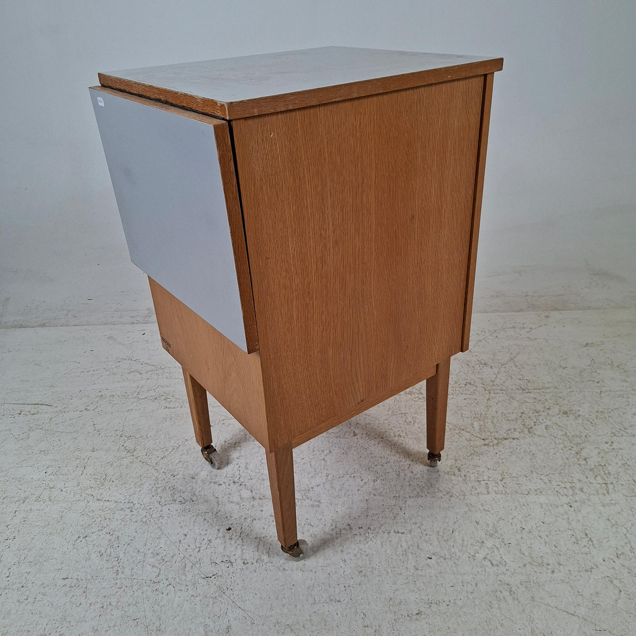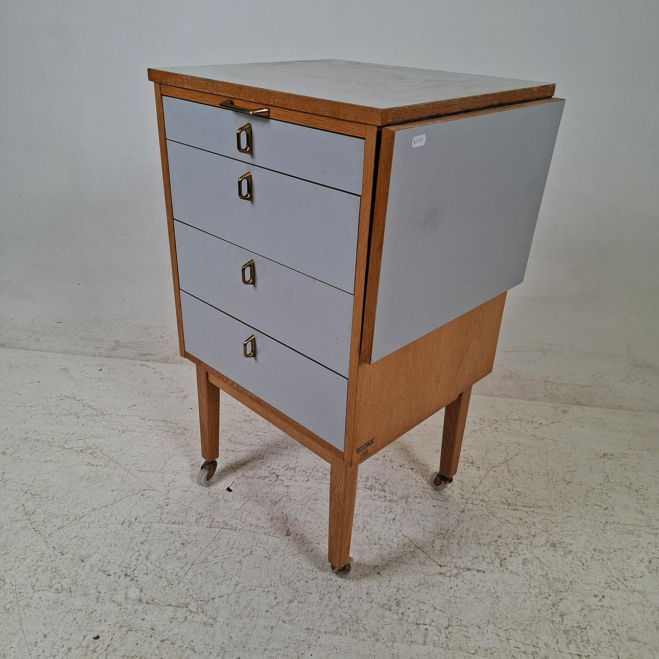 With boxes, oak, on wheels, labeled. Length approx. 49, width 43, height 81.5 cm. Flap, length approx. 30 cm.
