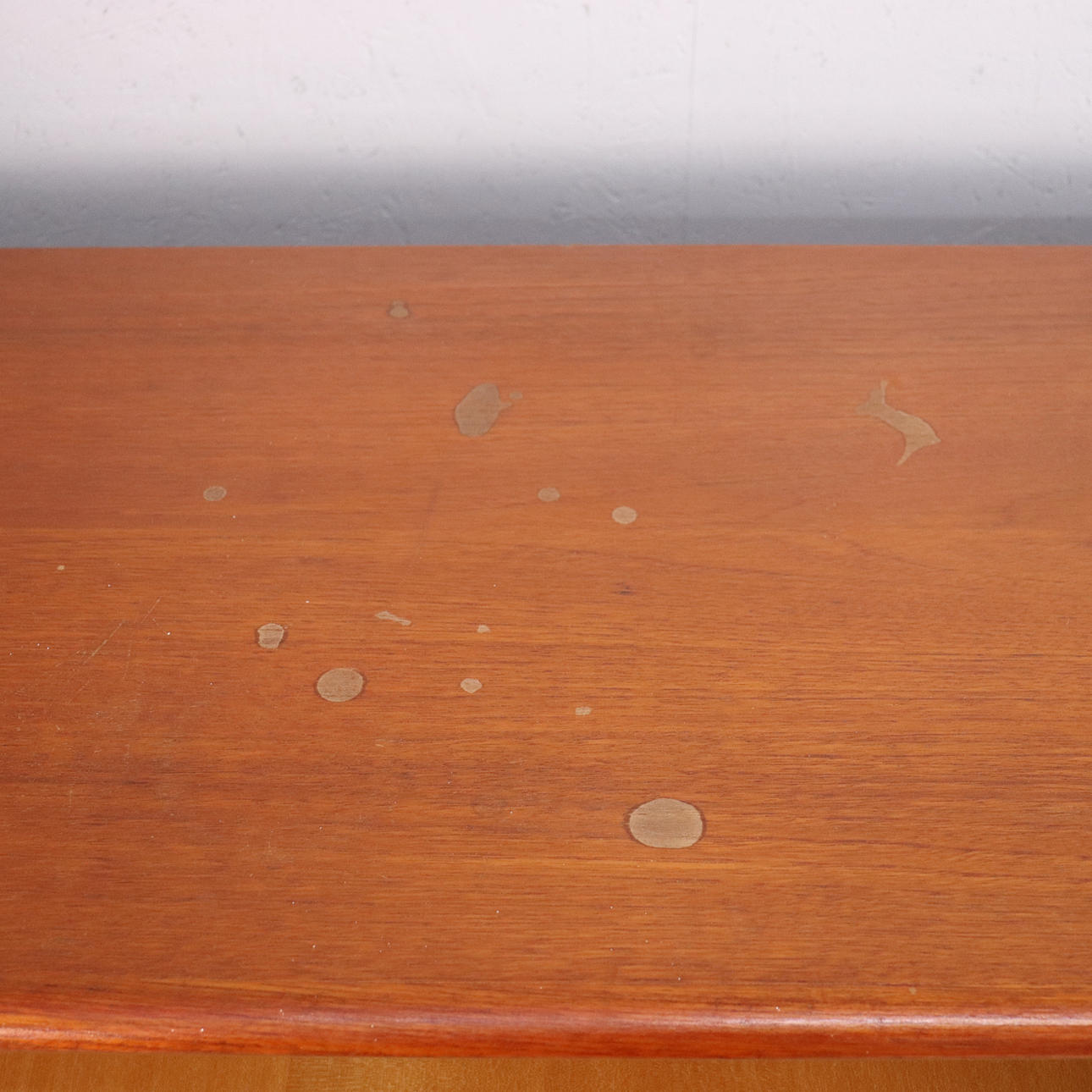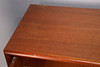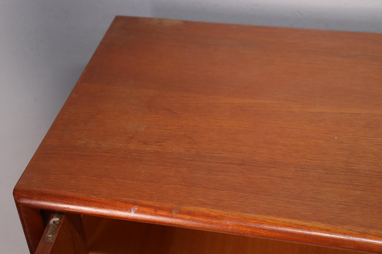 Sideboard in teak with birch veneer decor. Two cabinet parts, one with two removable shelves, one with two pull-out drawers and one removable shelf.